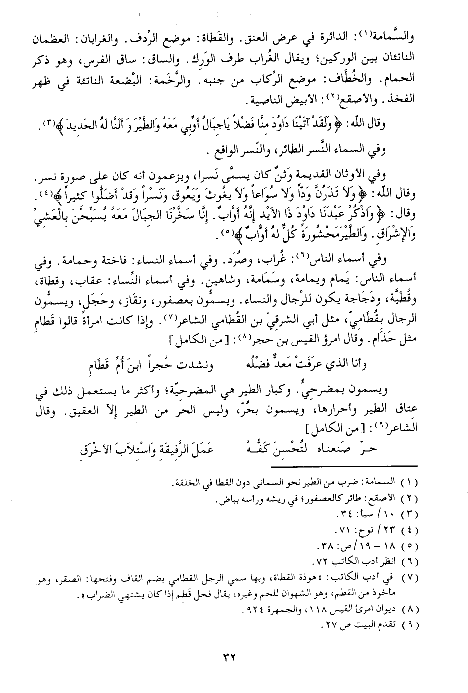 ويسمون بمضرحيّ. وكبار الطير هي المضرحيّة؛ وأكثر ما يستعمل ذلك في عتاق الطير وأحرارها، ويسمون بحرّ، وليس الحر من الطير إلّا العقيق. وقال الشاعر «9» : [من الكامل]