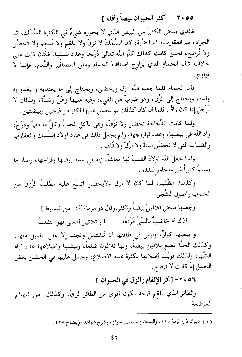 ولما كانت الدّجاجة تحضن ولا تزقّ، وهي تأكل الحبّ وكلّ ما دبّ ودرج، زاد الله في بيضها، وعدد فراريجها، ولم يجعل ذلك في عدد أولاد السّمك والعقارب والضّباب التي لا تحضن البتة ولا تزقّ ولا تلقم.