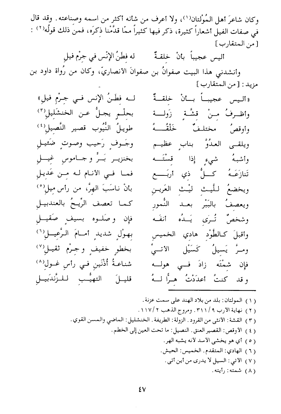 وكان شاعر أهل المولتان «1» ، ولا أعرف من شأنه أكثر من اسمه وصناعته. وقد قال في صفات الفيل أشعارا كثيرة، ذكر فيها كثيرا ممّا قدّمنا ذكره، فمن ذلك قوله «2» :