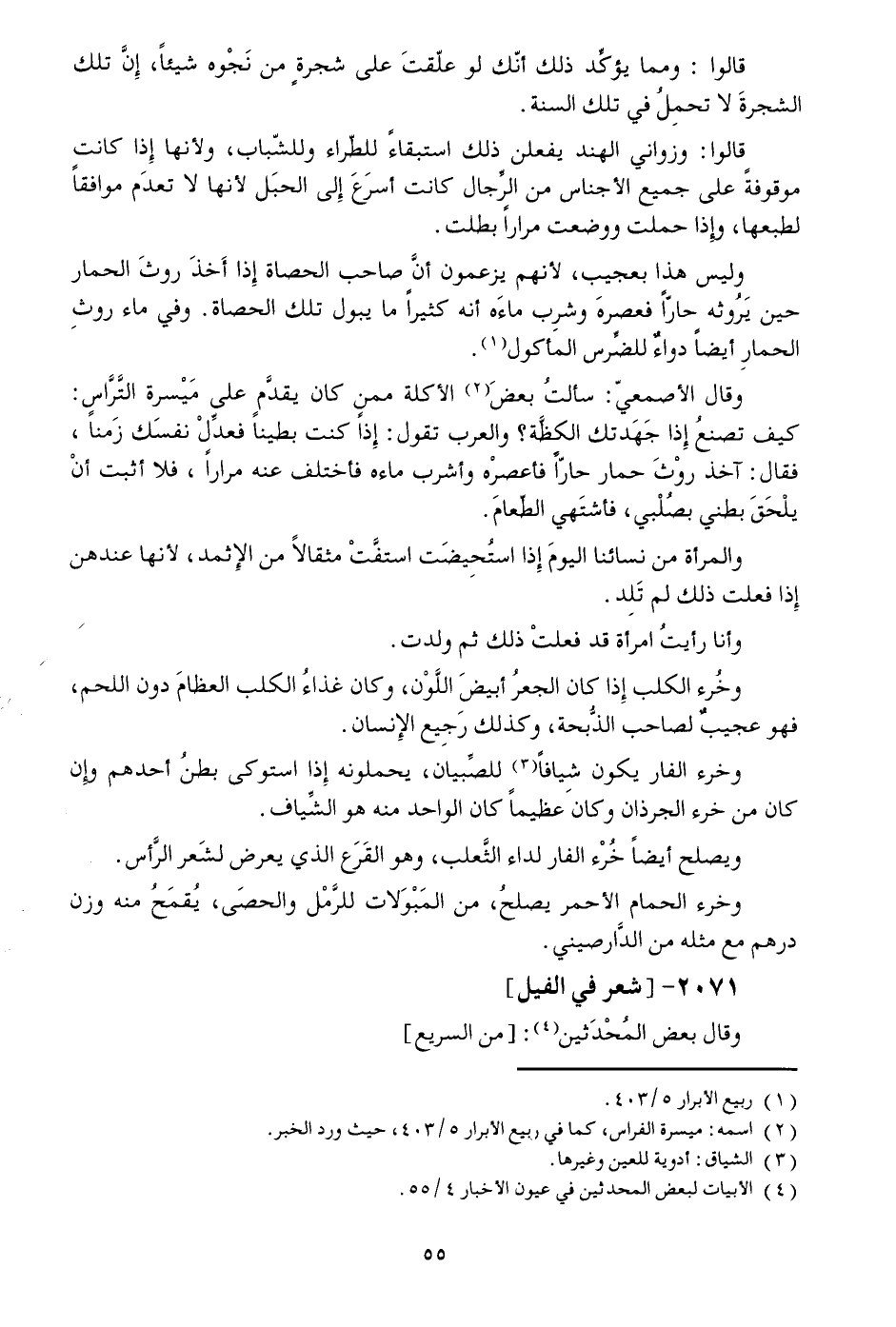 وليس هذا بعجيب، لأنهم يزعمون أنّ صاحب الحصاة إذا أخذ روث الحمار حين يروثه حارّا فعصره وشرب ماءه أنه كثيرا ما يبول تلك الحصاة. وفي ماء روث الحمار أيضا دواء للضّرس المأكول «1» .