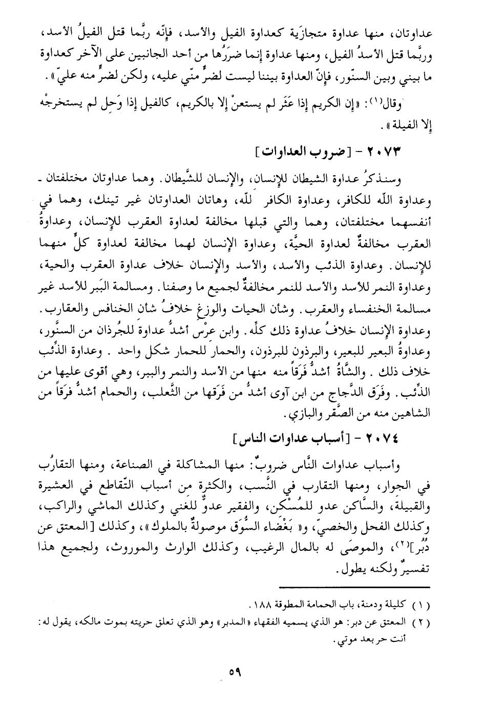 وسنذكر عداوة الشيطان للإنسان، والإنسان للشّيطان. وهما عداوتان مختلفتان- وعداوة الله للكافر، وعداوة الكافر لله، وهاتان العداوتان غير تينك، وهما في أنفسهما مختلفتان، وهما والتي قبلها مخالفة لعداوة العقرب للإنسان، وعداوة العقرب مخالفة لعداوة الحيّة، وعداوة الإنسان لهما مخالفة لعداوة كلّ منهما للإنسان. وعداوة الذئب والأسد، والأسد والإنسان خلاف عداوة العقرب والحية، وعداوة النمر للأسد والأسد للنمر مخالفة لجميع ما وصفنا. ومسالمة الببر للأسد غير مسالمة الخنفساء والعقرب. وشأن الحيات والوزغ خلاف شأن الخنافس والعقارب.