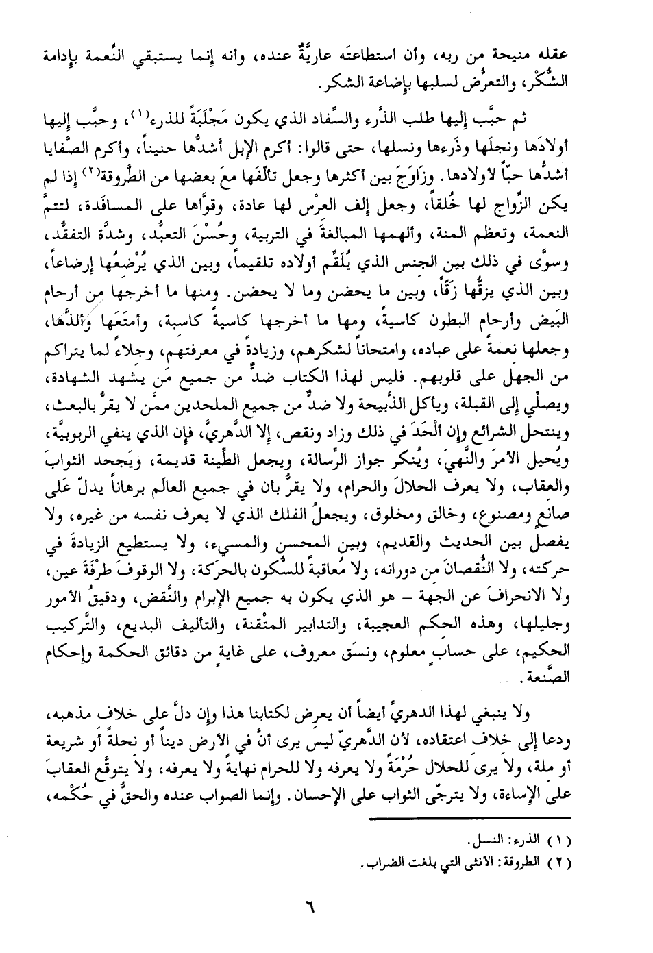 ولا ينبغي لهذا الدهريّ أيضا أن يعرض لكتابنا هذا وإن دلّ على خلاف مذهبه، ودعا إلى خلاف اعتقاده، لأن الدّهريّ ليس يرى أنّ في الأرض دينا أو نحلة أو شريعة أو ملة، ولا يرى للحلال حرمة ولا يعرفه ولا للحرام نهاية ولا يعرفه، ولا يتوقّع العقاب على الإساءة، ولا يترجّى الثواب على الإحسان. وإنما الصواب عنده والحقّ في حكمه،