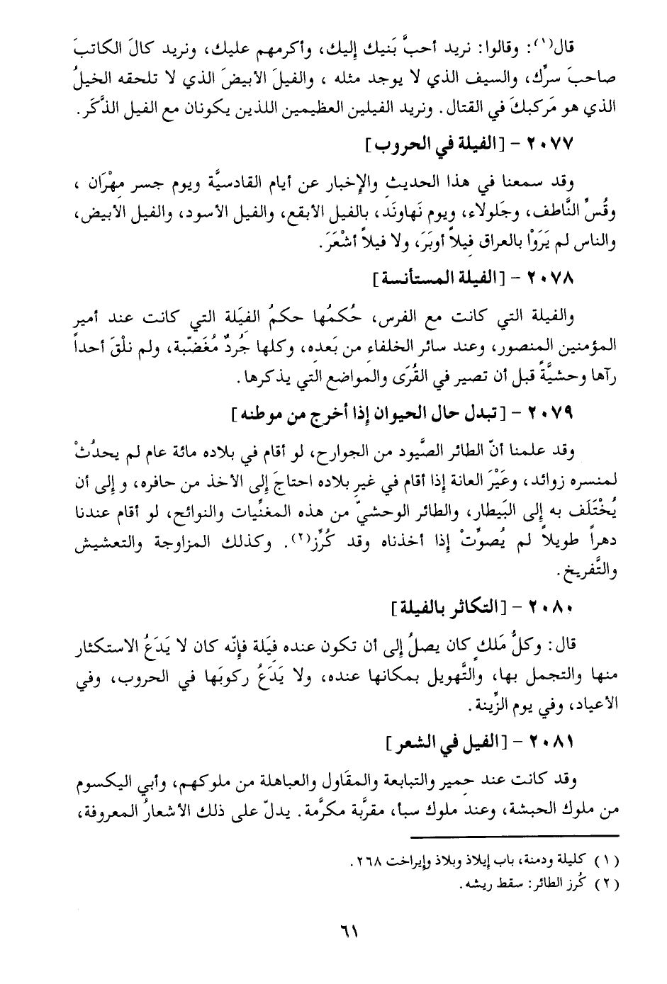 وقد سمعنا في هذا الحديث والإخبار عن أيام القادسيّة ويوم جسر مهران، وقسّ النّاطف، وجلولاء، ويوم نهاوند، بالفيل الأبقع، والفيل الأسود، والفيل الأبيض، والناس لم يروا بالعراق فيلا أوبر، ولا فيلا أشعر.