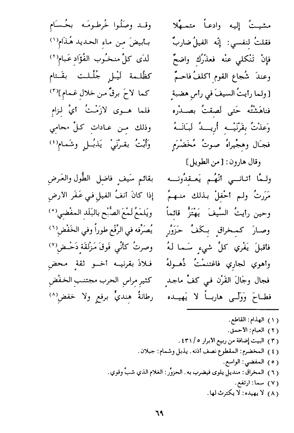 فقلت لنفسي: إنّه الفيل ضارب ... بأبيض من ماء الحديد هذام «1»