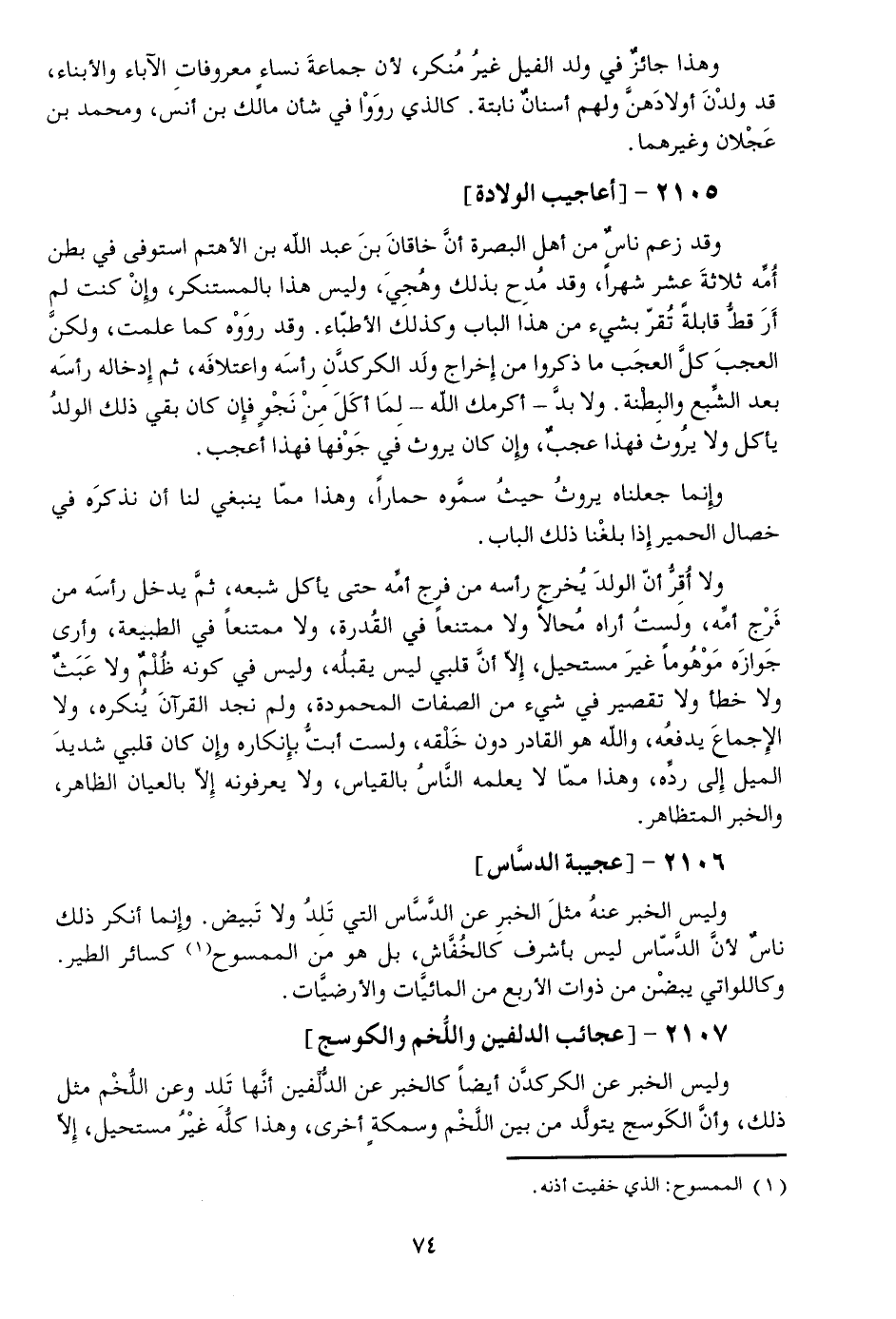 وليس الخبر عن الكركدّن أيضا كالخبر عن الدّلفين أنّها تلد وعن اللّخم مثل ذلك، وأنّ الكوسج يتولّد من بين اللّخم وسمكة أخرى، وهذا كلّه غير مستحيل، إلّا