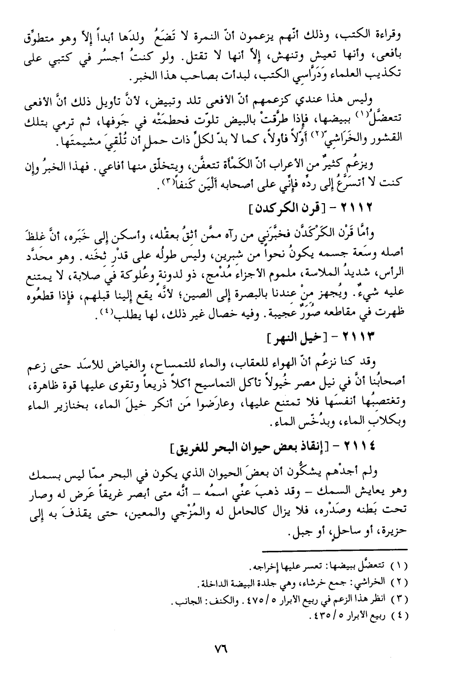 وأمّا قرن الكركدّن فخبّرني من رآه ممّن أثق بعقله، وأسكن إلى خبره، أنّ غلظ أصله وسعة جسمه يكون نحوا من شبرين، وليس طوله على قدر ثخنه. وهو محدّد الرأس، شديد الملاسة، ملموم الأجزاء مدمج، ذو لدونة وعلوكة في صلابة، لا يمتنع عليه شيء. ويجهز من عندنا بالبصرة إلى الصين؛ لأنّه يقع إلينا قبلهم، فإذا قطعوه ظهرت في مقاطعه صور عجيبة. وفيه خصال غير ذلك، لها يطلب «4» .