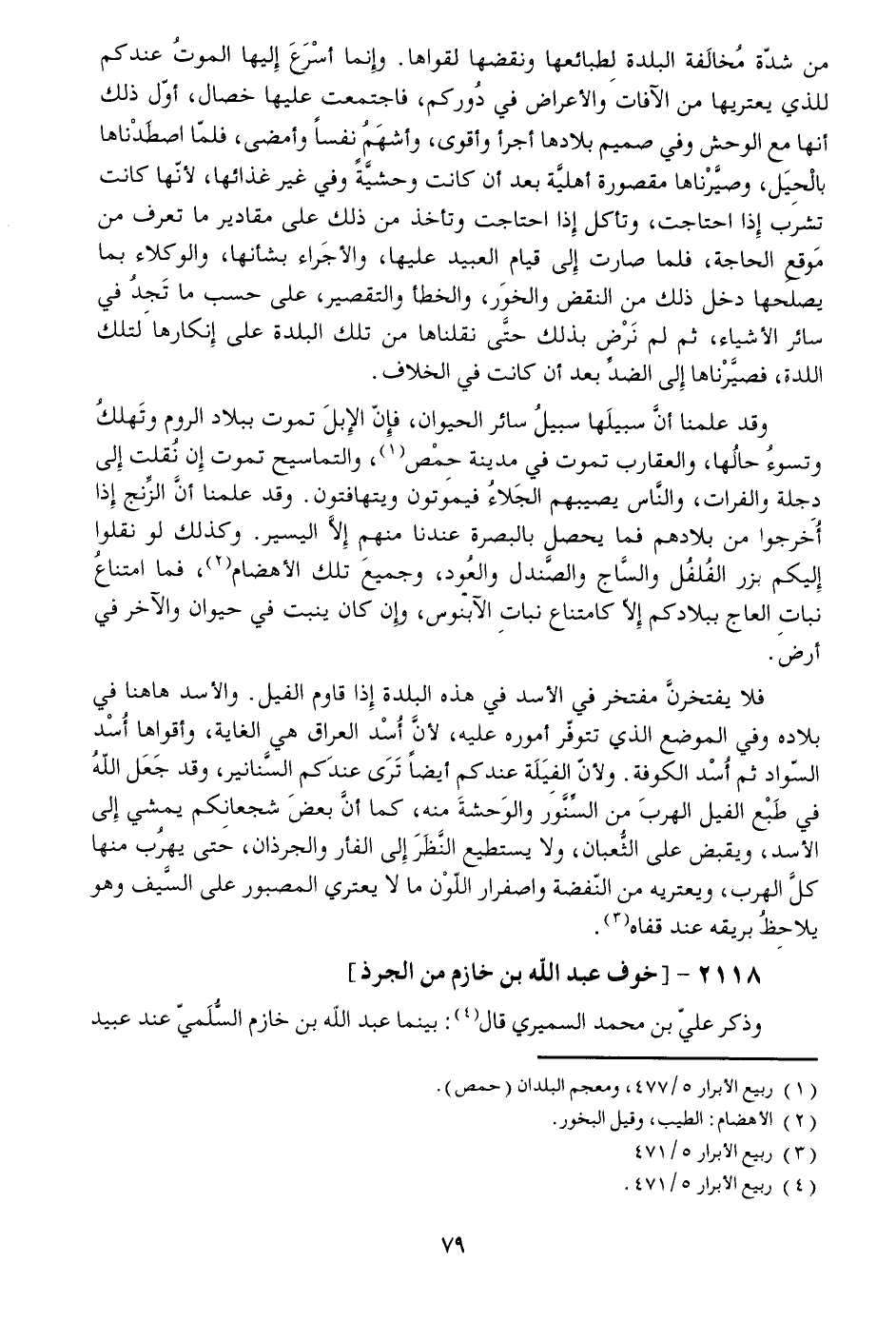فلا يفتخرنّ مفتخر في الأسد في هذه البلدة إذا قاوم الفيل. والأسد هاهنا في بلاده وفي الموضع الذي تتوفّر أموره عليه، لأنّ أسد العراق هي الغاية، وأقواها أسد السّواد ثم أسد الكوفة. ولأنّ الفيلة عندكم أيضا ترى عندكم السّنانير، وقد جعل الله في طبع الفيل الهرب من السّنّور والوحشة منه، كما أنّ بعض شجعانكم يمشي إلى الأسد، ويقبض على الثّعبان، ولا يستطيع النّظر إلى الفأر والجرذان، حتى يهرب منها كلّ الهرب، ويعتريه من النّفضة واصفرار اللّون ما لا يعتري المصبور على السّيف وهو يلاحظ بريقه عند قفاه «3» .