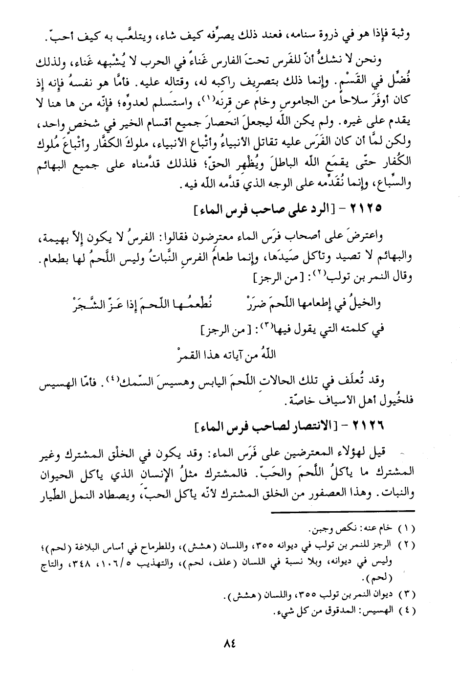 ونحن لا نشكّ أنّ للفرس تحت الفارس غناء في الحرب لا يشبهه غناء، ولذلك فضّل في القسم. وإنما ذلك بتصريف راكبه له، وقتاله عليه. فأمّا هو نفسه فإنه إذ كان أوفر سلاحا من الجاموس وخام عن قرنه «1» ، واستسلم لعدوّه؛ فإنّه من ها هنا لا يقدم على غيره. ولم يكن الله ليجعل انحصار جميع أقسام الخير في شخص واحد، ولكن لمّا أن كان الفرس عليه تقاتل الأنبياء وأتباع الأنبياء، ملوك الكفّار وأتباع ملوك الكفار حتّى يقمع الله الباطل ويظهر الحقّ؛ فلذلك قدّمناه على جميع البهائم والسّباع، وإنما نقدّمه على الوجه الذي قدّمه الله فيه.