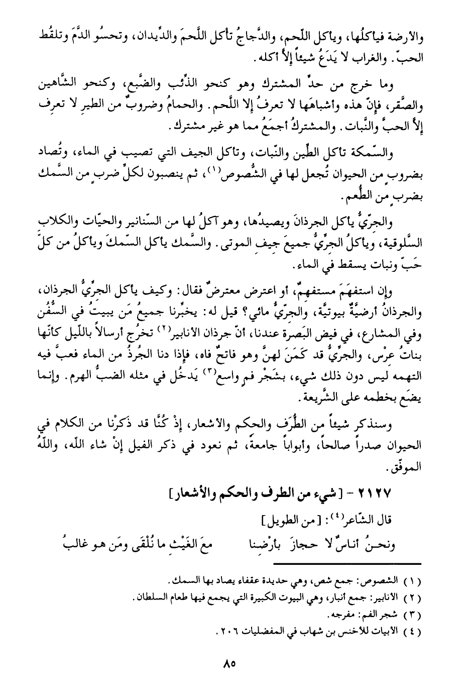 وسنذكر شيئا من الطّرف والحكم والأشعار، إذ كنّا قد ذكرنا من الكلام في الحيوان صدرا صالحا، وأبوابا جامعة، ثم نعود في ذكر الفيل إن شاء الله، والله الموفّق.