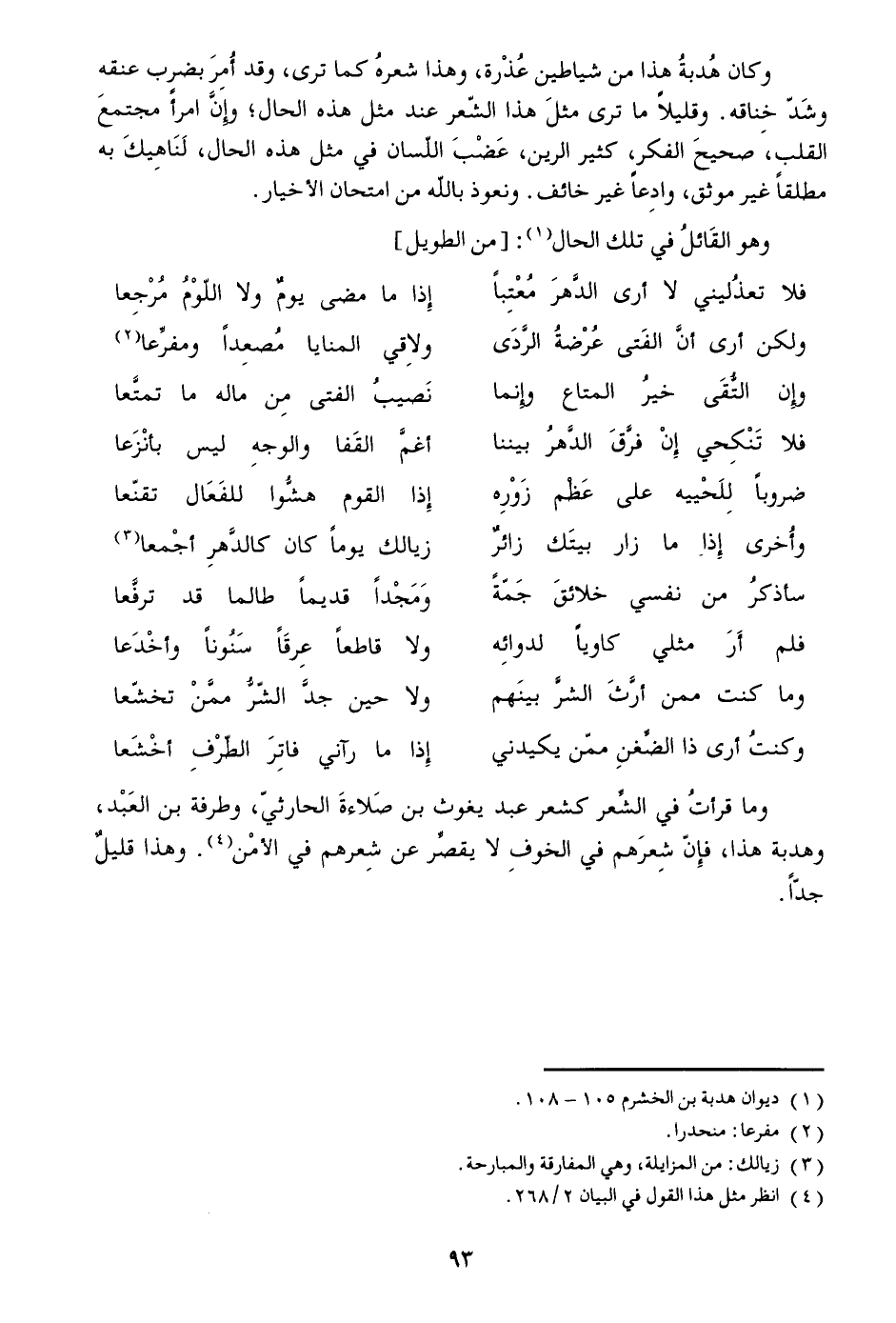 وما قرأت في الشّعر كشعر عبد يغوث بن صلاءة الحارثيّ، وطرفة بن العبد، وهدبة هذا، فإنّ شعرهم في الخوف لا يقصّر عن شعرهم في الأمن «4» . وهذا قليل جدّا.