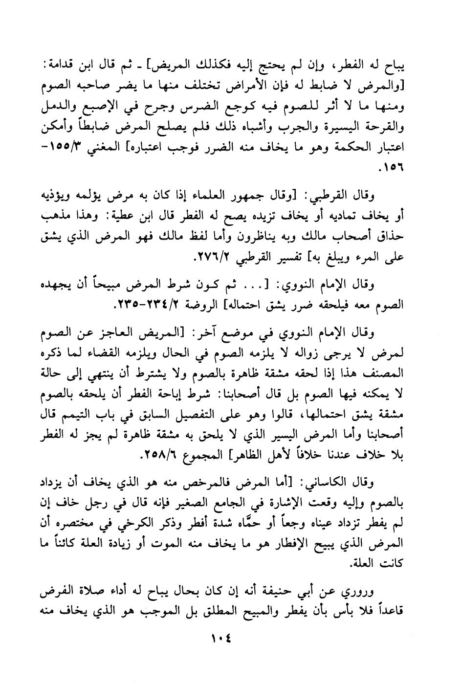 يباح له الفطر وإن لم يحتج إليه فكذلك المريض]. ثم قال ابن قدامة: [والمرض لا ضابط له فإن الأمراض تختلف منها ما يضر صاحبه الصوم ومنها ما لا أثر للصوم فيه كوجع الضرس وجرح في الإصبع والدمل والقرحة اليسيرة والجرب وأشباه ذلك فلم يصلح المرض ضابطاً وأمكن اعتبار الحكمة وهو ما يخاف منه الضرر فوجب اعتباره] المغني 3/ 155 - 156.
