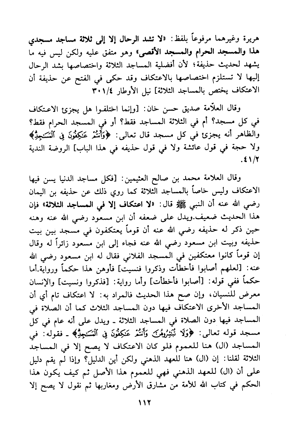 وقال العلامة محمد بن صالح العثيمين: [فكل مساجد الدنيا يسن فيها الاعتكاف وليس خاصاً بالمساجد الثلاثة كما روي ذلك عن حذيفه بن اليمان- رضي الله عنه - أن النبي - صَلَّى اللهُ عَلَيْهِ وَسَلَّمَ - قال: (لااعتكاف إلا في المساجد الثلاثة) فإن هذا الحديث ضعيف. ويدل على ضعفه أن ابن مسعود - رضي الله عنه - وهنه حين ذكر له حذيفه - رضي الله عنه - أن قوماً يعتكفون في مسجد بين بيت حذيفه وبيت ابن مسعود - رضي الله عنه - فجاء إلى ابن مسعود زائراً له وقال إن قوماً كانوا معتكفين في المسجد الفلاني فقال له ابن مسعود - رضي الله عنه -: [لعلهم أصابوا فأخطأت وذكروا فنسيت] فأوهن هذا حكماً ورواية. أما حكماً ففي قوله: [أصابوا فأخطأت] وأما رواية: [فذكروا ونسيت] والإنسان معرض للنسيان وإن صح هذا الحديث فالمراد به: لا اعتكاف تام أي أن المساجد الأخرى الاعتكاف فيها دون المساجد الثلاث كما أن الصلاة في المساجد فيها دون الصلاة في المساجد الثلاثة. ويدل على أنه عام في كل مسجد قوله تعالى: (وَلَا تُبَاشِرُوهُنَّ وَأَنْتُمْ عَاكِفُونَ فِي الْمَسَاجِدِ). فقوله: في المساجد (ال) هنا للعموم فلو كان الاعتكاف لا يصح إلا في المساجد الثلاثة لقلنا: إن (ال) هنا للعهد الذهني ولكن أين الدليل؟ وإذا لم يقم دليل على أن (ال) للعهد الذهني فهي للعموم هذا الأصل ثم كيف يكون هذا الحكم في كتاب الله للأمة من مشارق الأرض ومغاربها ثم نقول لا يصح إلا
