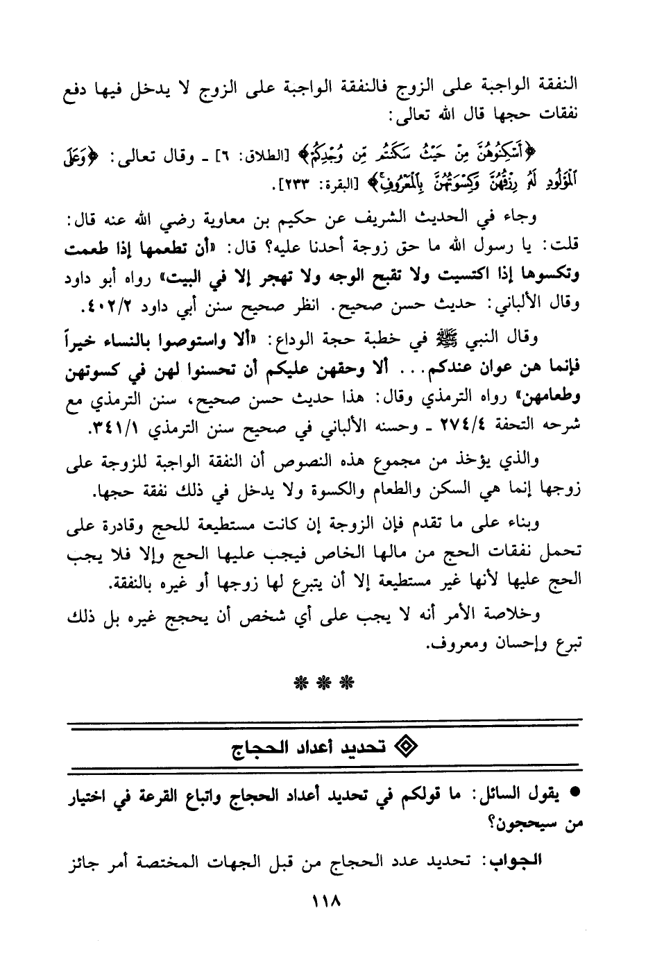 وقال النبي - صَلَّى اللهُ عَلَيْهِ وَسَلَّمَ - في خطبة حجة الوداع: (ألا واستوصوا بالنساء خيراً فإنما هن عوان عندكم ... ألا وحقهن عليكم أن تحسنوا لهن في كسوتهن وطعامهن) رواه الترمذي وقال: هذا حديث حسن صحيح، سنن الترمذي مع شرحه التحفة 4/ 274. وحسنه الألباني في صحيح سنن الترمذي 1/ 341.