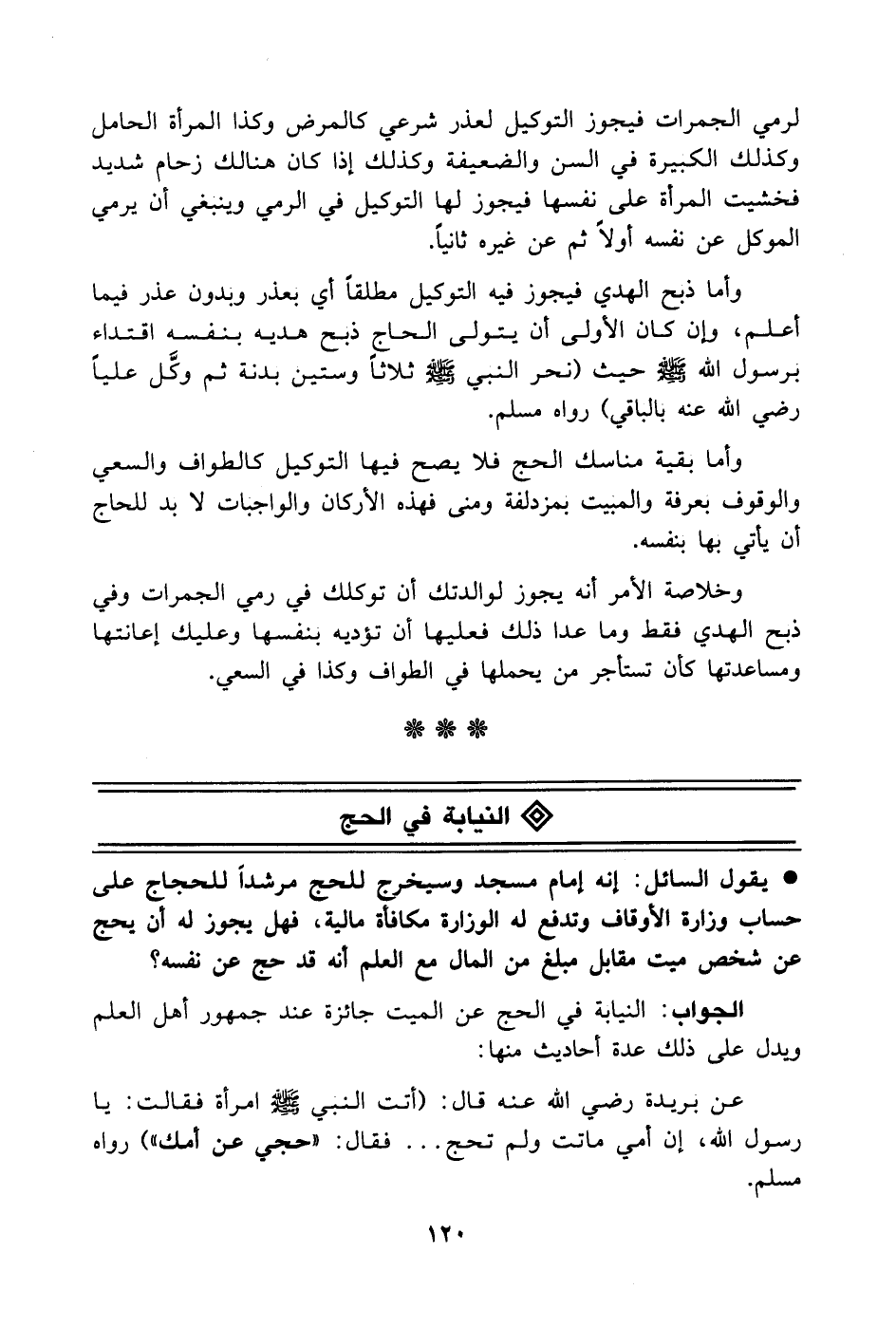 وأما بقية مناسك الحج فلا يصح فيها التوكيل كالطواف والسعي والوقوف بعرفة والمبيت بمزدلفة ومنى فهذه الأركان والواجبات لا بد للحاج أن يأتي بها بنفسه.