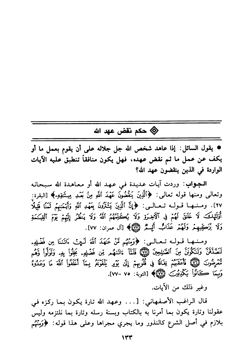 قال الراغب الأصفهاني: [. وعهد الله تارة يكون بما ركزه في عقولنا وتارة يكون بما أمرنا به بالكتاب وبالسنة رسله وتارة بما نلتزمه وليس بلازم في أصل الشرع كالنذور وما يجري مجراها وعلى هذا قوله: (وَمِنْهُمْ