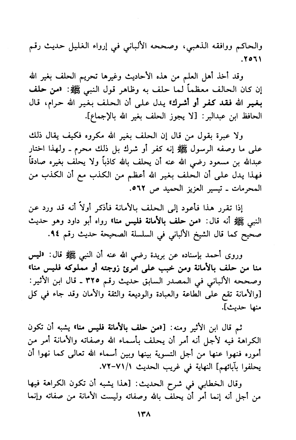 ثم قال ابن الأثير ومنه: [(من حلف بالأمانة فليس منا) يشبه أن تكون الكراهة فيه لأجل أنه أمر أن يحلف بأسماء الله وصفاته والأمانة أمر من أموره فنهوا عنها من أجل التسوية بينها وبين أسماء الله تعالى كما نهوا أن يحلفوا بآبائهم] النهاية في غريب الحديث 1/ 71 - 72.