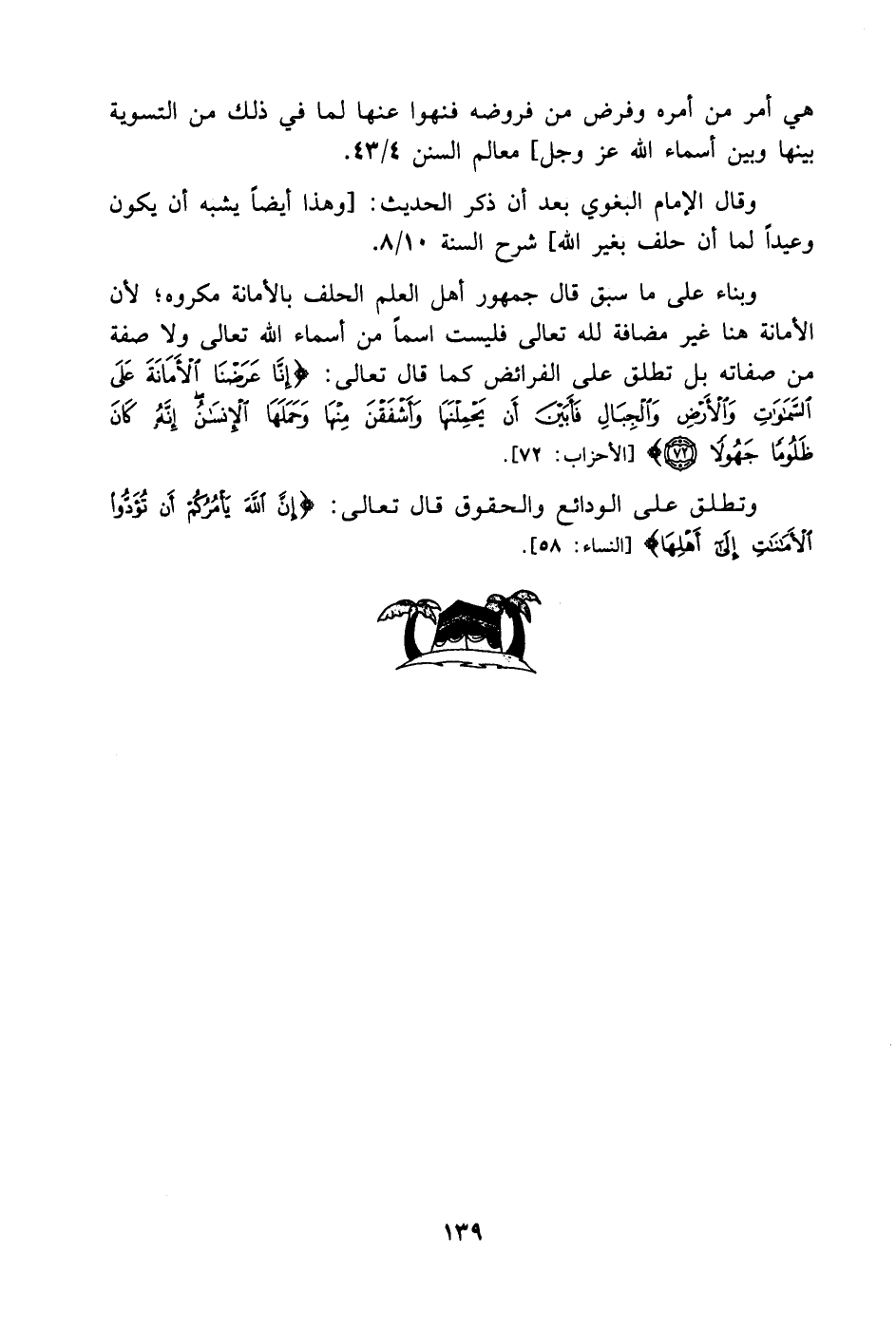 وبناء على ما سبق قال جمهور أهل العلم الحلف بالأمانة مكروه لأن الأمانة هنا غير مضافة لله تعالى فليست اسماً من أسماء الله تعالى ولا صفة من صفاته بل تطلق على الفرائض كما قال تعالى: (إِنَّا عَرَضْنَا الْأَمَانَةَ عَلَى السَّمَوَاتِ وَالْأَرْضِ. الآية) سورة الأحزاب الآية 72.