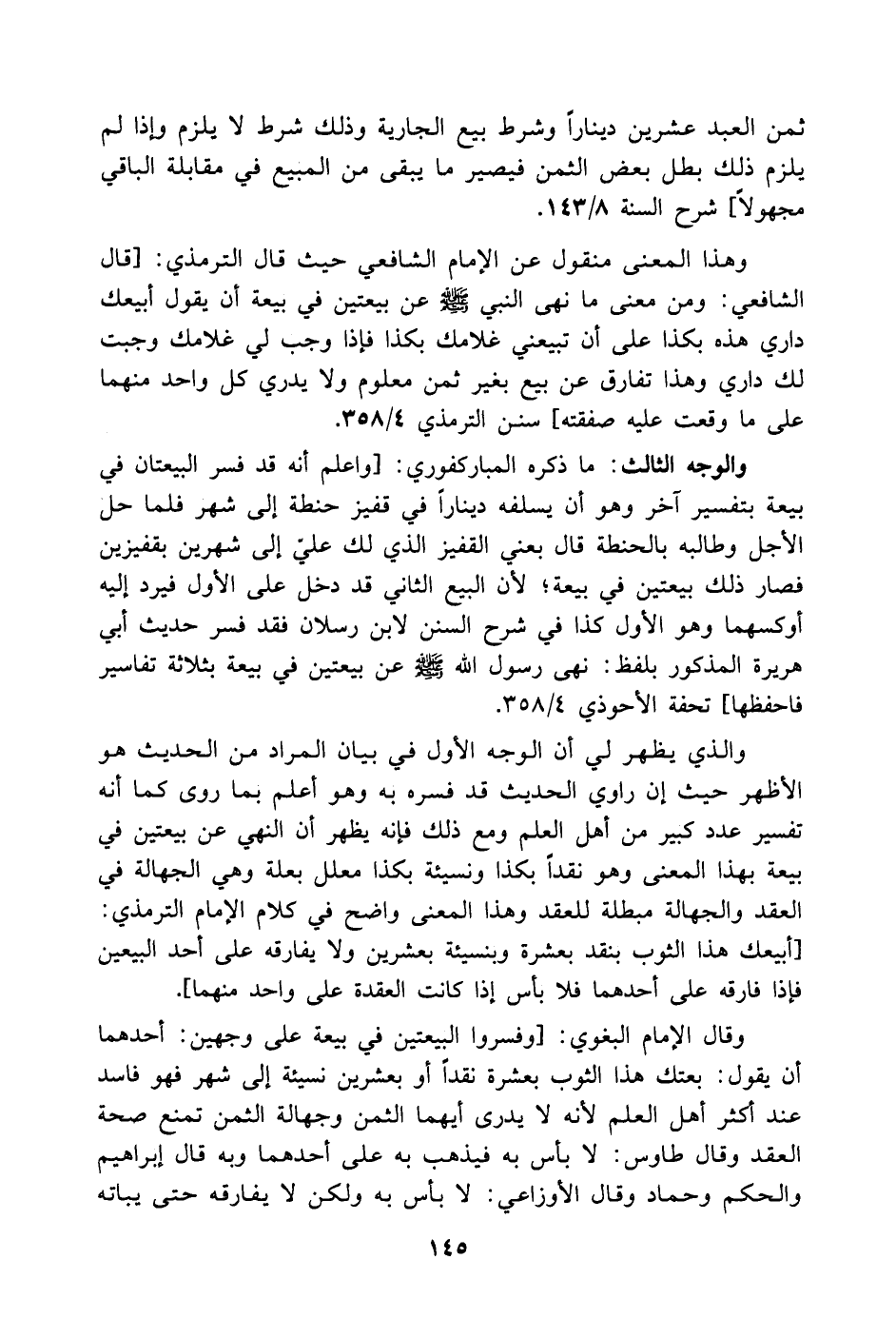 والذي يظهر لي أن الوجه الأول في بيان المراد من الحديث هو الأظهر حيث إن راوي الحديث قد فسره به وهو أعلم بما روى كما أنه تفسير عدد كبير من أهل العلم ومع ذلك فإنه يظهر أن النهي عن بيعتين في بيعة بهذا المعنى وهو نقداً بكذا ونسيئة بكذا معلل بعلة وهي الجهالة في العقد والجهالة مبطلة للعقد وهذا المعنى واضح في كلام الإمام الترمذي: [أبيعك هذا الثوب بنقد بعشرة وبنسيئة بعشرين ولا يفارقه على أحد البيعين فإذا فارقه على أحدهما فلا بأس إذا كانت العقدة على واحد منهما].