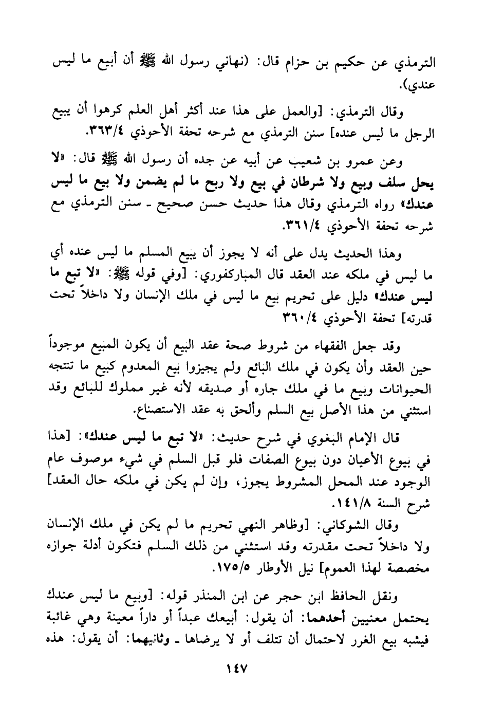 وقال الترمذي: [والعمل على هذا عند أكثر أهل العلم كرهوا أن يبيع الرجل ما ليس عنده] سنن الترمذي مع شرحه تحفة الأحوذي 4/ 363.