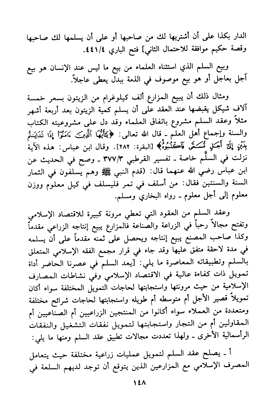 وعقد السلم من العقود التي تعطي مرونة كبيرة للاقتصاد الإسلامي وتفتح مجالاً رحباً في الزراعة والصناعة فالمزارع يبيع إنتاجه الزراعي مقدماً وكذا صاحب المصنع يبيع إنتاجه ويحصل على ثمنه مقدماً على أن يسلمه في مدة لاحقة متفق عليها وقد جاء في قرار مجمع الفقه الإسلامي المتعلق بالسلم وتطبيقاته المعاصرة ما يلي: [يعد السلم في عصرنا الحاضر أداة تمويل ذات كفاءة عالية في الاقتصاد الإسلامي وفي نشاطات المصارف الإسلامية من حيث مرونتها واستجابتها لحاجات التمويل المختلفة سواء أكان تمويلاً قصير الأجل أم متوسطه أم طويله واستجابتها لحاجات شرائح مختلفة ومتعددة من العملاء سواء أكانوا من المنتجين الزراعيين أم الصناعيين أم المقاولين أم من التجار واستجابتها لتمويل نفقات التشغيل والنفقات الرأسمالية الأخرى. ولهذا تعددت مجالات تطبيق عقد السلم ومنها ما يلي: