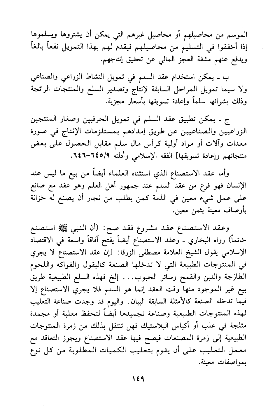 ج. يمكن تطبيق عقد السلم في تمويل الحرفيين وصغار المنتجين الزراعيين والصناعيين عن طريق إمدادهم بمستلزمات الإنتاج في صورة معدات وآلات أو مواد أولية كرأس مال سلم مقابل الحصول على بعض منتجاتهم وإعادة تسويقها] الفقه الإسلامي وأدلته 9/ 645 - 646.