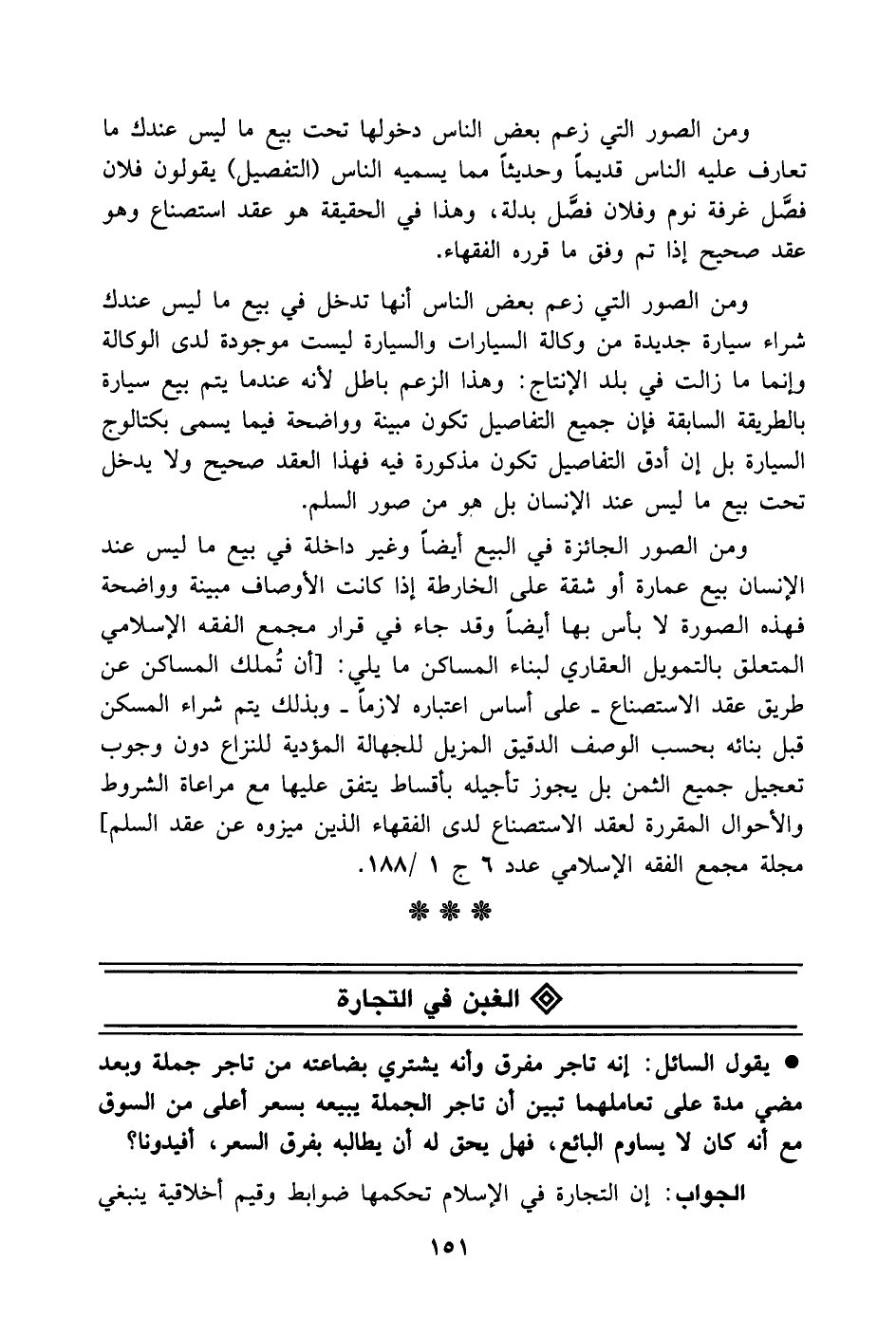 ومن الصور الجائزة في البيع أيضاً وغير داخلة في بيع ما ليس عند الإنسان بيع عمارة أو شقة على الخارطة إذا كانت الأوصاف مبينة وواضحة فهذه الصورة لا بأس بها أيضاً وقد جاء في قرار مجمع الفقه الإسلامي المتعلق بالتمويل العقاري لبناء المساكن ما يلي: [أن تُملك المساكن عن طريق عقد الاستصناع - على أساس اعتباره لازماً - وبذلك يتم شراء المسكن قبل بنائه بحسب الوصف الدقيق المزيل للجهالة المؤدية للنزاع دون وجوب تعجيل جميع الثمن بل يجوز تأجيله بأقساط يتفق عليها مع مراعاة الشروط والأحوال المقررة لعقد الاستصناع لدى الفقهاء الذين ميزوه عن عقد السلم] مجلة مجمع الفقه الإسلامي عدد 6 ج 1/ 188.