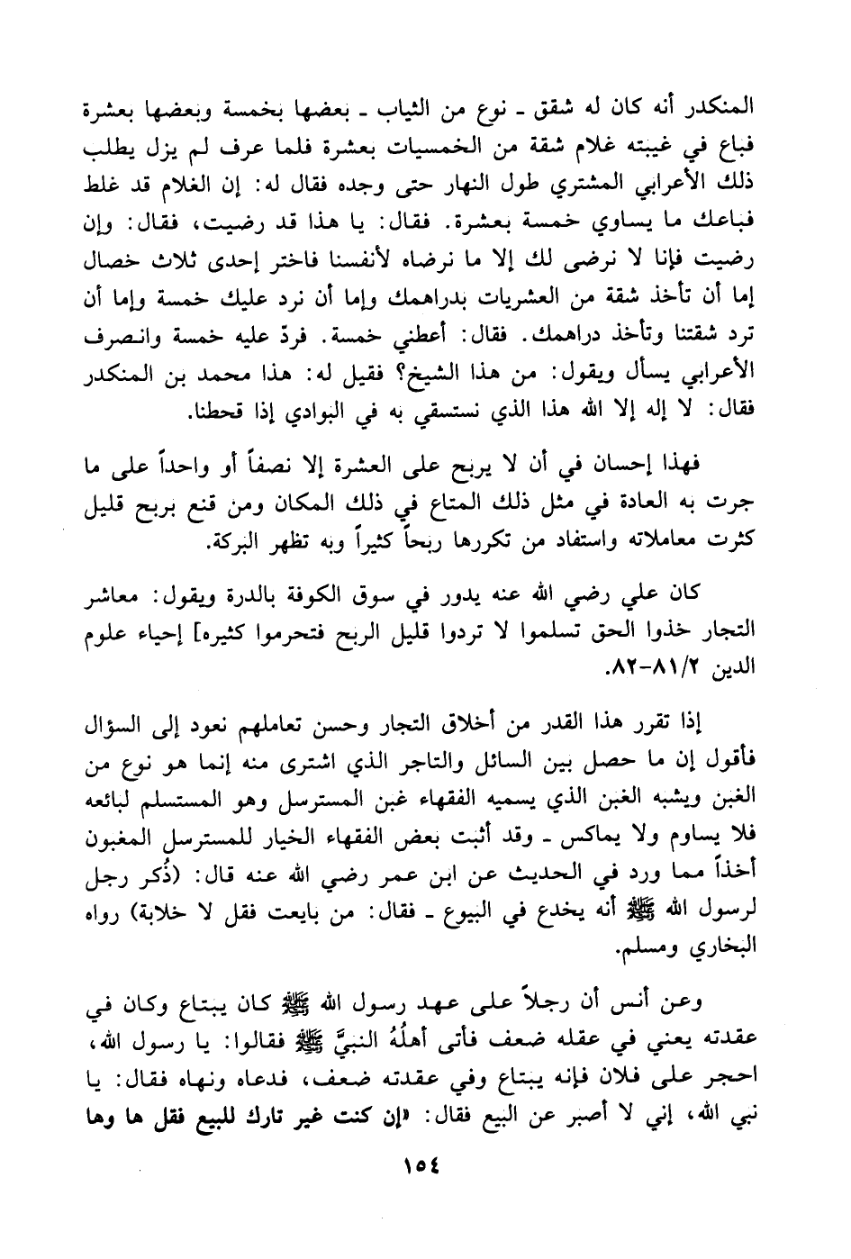 وبعضها بعشرة فباع في غيبته غلام شقة من الخمسيات بعشرة فلما عرف لم يزل يطلب ذلك الأعرابي المشتري طول النهار حتى وجده فقال له: إن الغلام قد غلط فباعك ما يساوي خمسة بعشرة. فقال: يا هذا قد رضيت، فقال: وإن رضيت فإنا لا نرضى لك إلا ما نرضاه لأنفسنا فاختر إحدى ثلاث خصال إما أن تأخذ شقة من العشريات بدراهمك وإما أن نرد عليك خمسة وإما أن ترد شقتنا وتأخذ دراهمك. فقال: أعطني خمسة. فردّ عليه خمسة وانصرف الأعرابي يسأل ويقول: من هذا الشيخ؟ فقيل له: هذا محمد بن المنكدر فقال: لا إله إلا الله هذا الذي نستسقي به في البوادي إذا قحطنا.