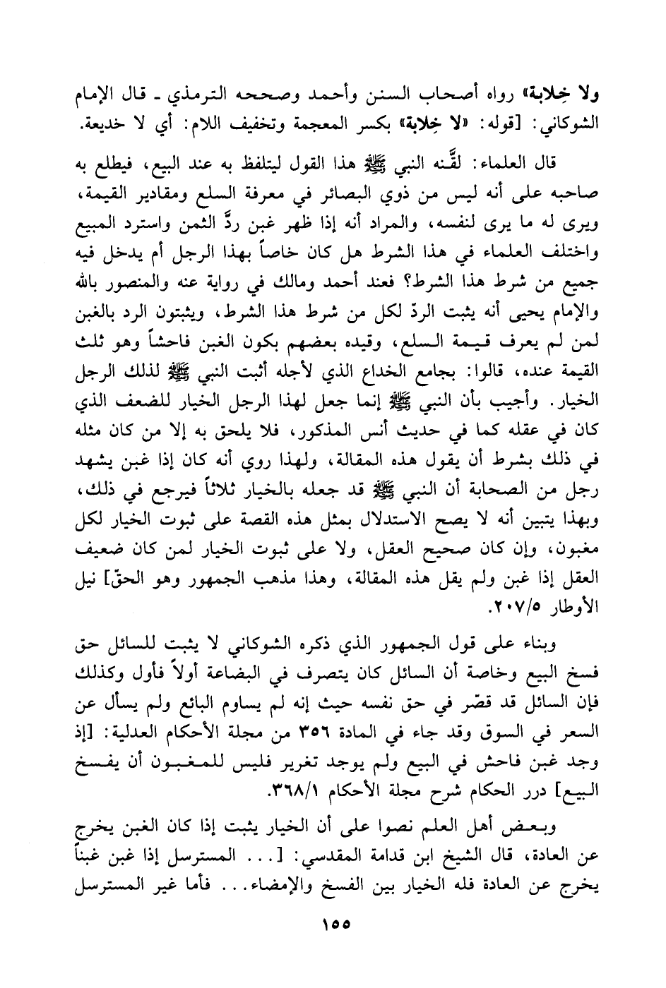 ولا خِلابة) رواه أصحاب السنن وأحمد وصححه الترمذي. قال الإمام الشوكاني: [قوله (لا خِلابة) بكسر المعجمة وتخفيف اللام: أي لا خديعة.