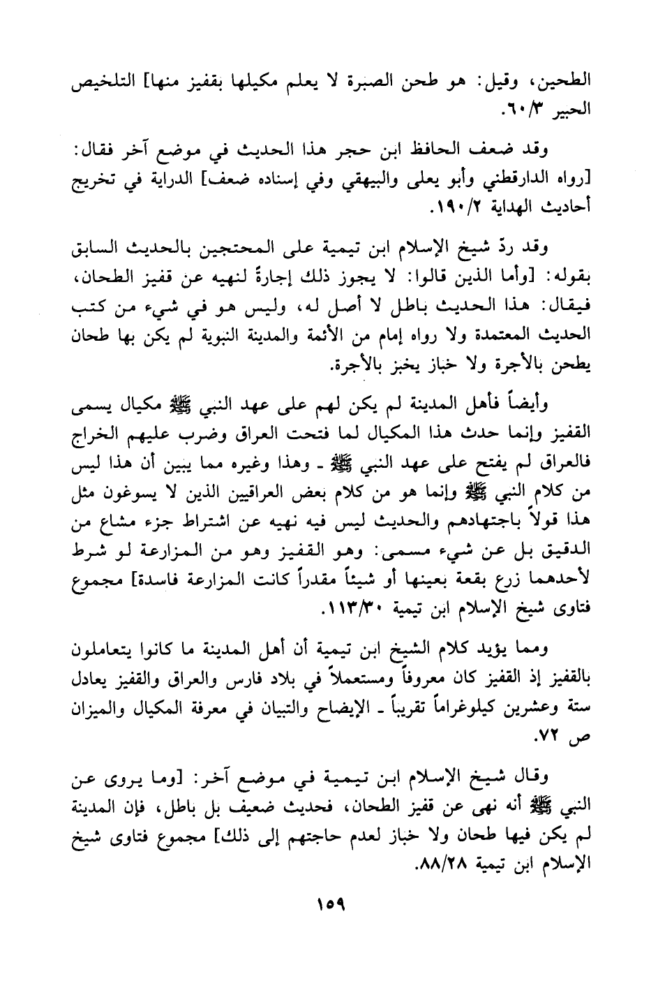 وقال شيخ الإسلام ابن تيمية في موضع آخر: [وما يروى عن النبي - صَلَّى اللهُ عَلَيْهِ وَسَلَّمَ - أنه نهى عن قفيز الطحان، فحديث ضعيف بل باطل، فإن المدينة لم يكن فيها طحان ولا خباز لعدم حاجتهم إلى ذلك] مجموع فتاوى شيخ الإسلام ابن تيمية 28/ 88.