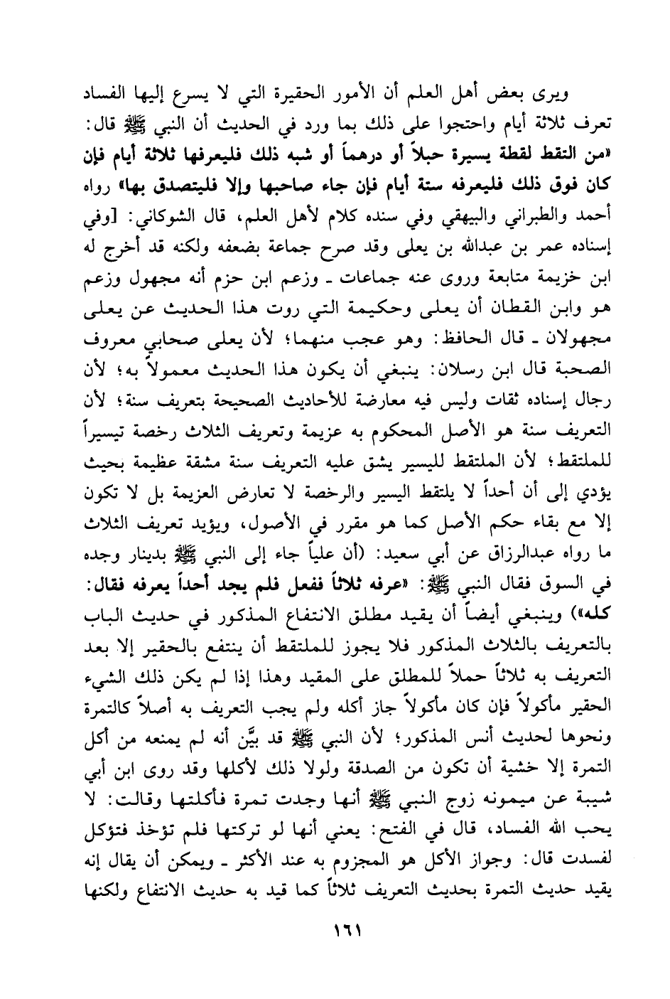 ويرى بعض أهل العلم أن الأمور الحقيرة التي لا يسرع إليها الفساد تعرف ثلاثة أيام واحتجوا على ذلك بما ورد في الحديث أن النبي - صَلَّى اللهُ عَلَيْهِ وَسَلَّمَ - قال: (من التقط لقطة يسيرة حبلاً أو درهماً أو شبه ذلك فليعرفها ثلاثة أيام فإن كان فوق ذلك فليعرفه ستة أيام فإن جاء صاحبها وإلا فليتصدق بها) رواه أحمد والطبراني والبيهقي وفي سنده كلام لأهل العلم، قال الشوكاني: [وفي إسناده عمر بن عبد الله بن يعلى وقد صرح جماعة بضعفه ولكنه قد أخرج له ابن خزيمة متابعة وروى عنه جماعات. وزعم ابن حزم أنه مجهول وزعم هو وابن القطان أن يعلى وحكيمة التي روت هذا الحديث عن يعلى مجهولان. قال الحافظ: وهو عجب منهما لأن يعلى صحابي معروف الصحبة قال ابن رسلان: ينبغي أن يكون هذا الحديث معمولاً به لأن رجال إسناده ثقات وليس فيه معارضة للأحاديث الصحيحة بتعريف سنة لأن التعريف سنة هو الأصل المحكوم به عزيمة وتعريف الثلاث رخصة تيسيراً للملتقط لأن الملتقط لليسير يشق عليه التعريف سنة مشقة عظيمة بحيث يؤدي إلى أن أحداً لا يلتقط اليسير والرخصة لا تعارض العزيمة بل لا تكون إلا مع بقاء حكم الأصل كما هو مقرر في الأصول ويؤيد تعريف الثلاث ما رواه عبد الرزاق عن أبي سعيد: (أن علياً جاء إلى النبي - صَلَّى اللهُ عَلَيْهِ وَسَلَّمَ - بدينار وجده في السوق فقال النبي - صَلَّى اللهُ عَلَيْهِ وَسَلَّمَ -: عرفه ثلاثاً ففعل فلم يجد أحداً يعرفه فقال: كله) وينبغي أيضاً أن يقيد مطلق الانتفاع المذكور في حديث الباب بالتعريف بالثلاث المذكور فلا يجوز للملتقط أن ينتفع بالحقير إلا بعد التعريف به ثلاثاً حملاً للمطلق على المقيد وهذا إذا لم يكن ذلك الشيء الحقير مأكولاً فإن كان مأكولاً جاز أكله ولم يجب التعريف به أصلاً كالتمرة ونحوها لحديث أنس المذكور لأن النبي - صَلَّى اللهُ عَلَيْهِ وَسَلَّمَ - قد بيَّن أنه لم يمنعه من أكل التمرة إلا خشية أن تكون من الصدقة ولولا ذلك لأكلها وقد روى