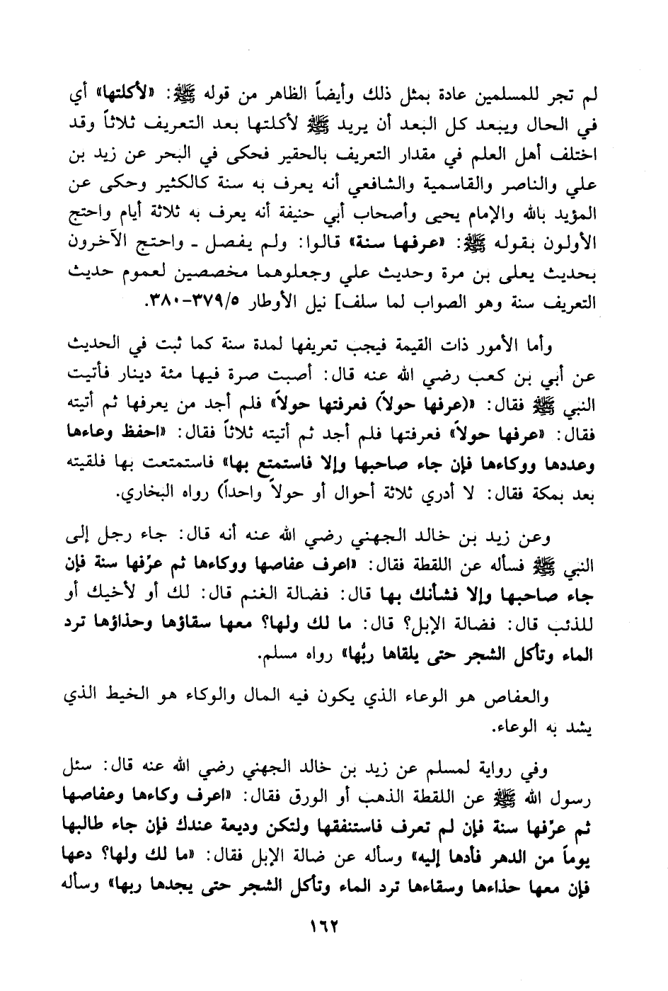 وفي رواية لمسلم عن زيد بن خالد الجهني - رضي الله عنه - قال: سئل رسول الله - صَلَّى اللهُ عَلَيْهِ وَسَلَّمَ - عن اللقطة الذهب أو الورق فقال: (اعرف وكاءها وعفاصها ثم عرِّفها سنة فإن لم تعرف فاستنفقها ولتكن وديعة عندك فإن جاء طالبها يوماً من الدهر فأدها إليه) وسأله عن ضالة الإبل فقال: (مالك ولها؟ دعها فإن معها حذاءها وسقاءها ترد الماء وتأكل الشجر حتى يجدها ربها) وسأله