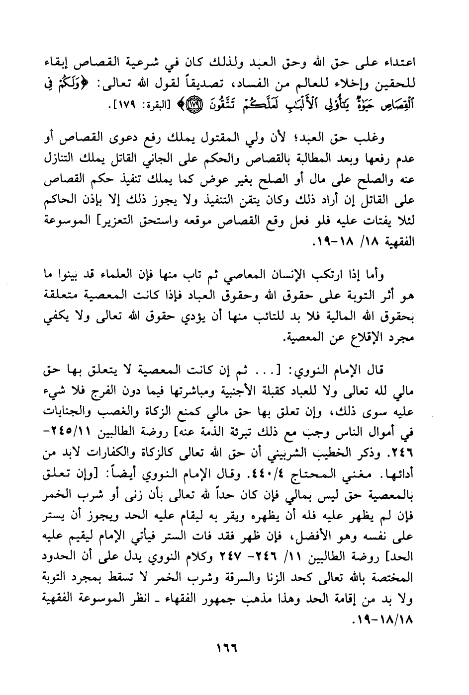 قال الإمام النووي: [. ثم إن كانت المعصية لا يتعلق بها حق مالي لله تعالى ولا للعباد كقبلة الأجنبية ومباشرتها فيما دون الفرج فلا شيء عليه سوى ذلك، وإن تعلق بها حق مالي كمنع الزكاة والغصب والجنايات في أموال الناس وجب مع ذلك تبرئة الذمة عنه] روضة الطالبين 11/ 245 - 246. وذكر الخطيب الشربيني أن حق الله تعالى كالزكاة والكفارات لابد من أدائها. مغني المحتاج 4/ 440. وقال الإمام النووي أيضاً: [وإن تعلق بالمعصية حق ليس بمالي فإن كان حدا لله تعالى بأن زنى أو شرب الخمر فإن لم يظهر عليه فله أن يظهره ويقر به ليقام عليه الحد ويجوز أن يستر على نفسه وهو الأفضل، فإن ظهر فقد فات الستر فيأتي الإمام ليقيم عليه الحد] روضة الطالبين 11/ 246 - 247 وكلام النووي يدل على أن الحدود المختصة بالله تعالى كحد الزنا والسرقة وشرب الخمر لا تسقط بمجرد التوبة ولا بد من إقامة الحد وهذا مذهب جمهور الفقهاء. انظر الموسوعة الفقهية 18/ 18 - 19.