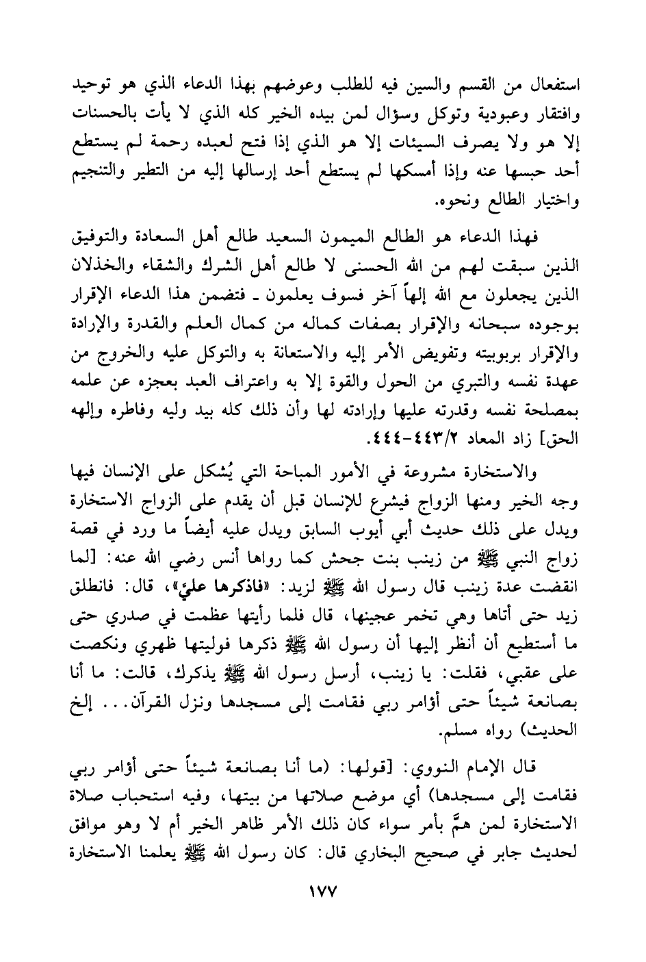 فهذا الدعاء هو الطالع الميمون السعيد طالع أهل السعادة والتوفيق الذين سبقت لهم من الله الحسنى لا طالع أهل الشرك والشقاء والخذلان الذين يجعلون مع الله إلهاً آخر فسوف يعلمون. فتضمن هذا الدعاء الإقرار بوجوده سبحانه والإقرار بصفات كماله من كمال العلم والقدرة والإرادة والإقرار بربوبيته وتفويض الأمر إليه والاستعانة به والتوكل عليه والخروج من عهدة نفسه والتبري من الحول والقوة إلا به واعتراف العبد بعجزه عن علمه بمصلحة نفسه وقدرته عليها وإرادته لها وأن ذلك كله بيد وليه وفاطره وإلهه الحق] زاد المعاد 2/ 443 - 444.