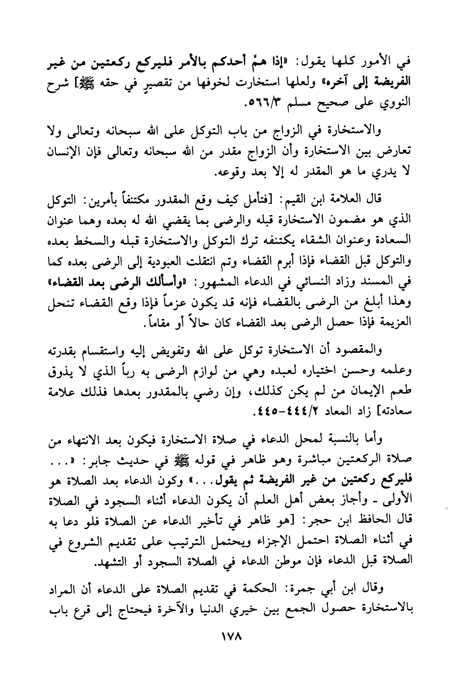 والمقصود أن الاستخارة توكل على الله وتفويض إليه واستقسام بقدرته وعلمه وحسن اختياره لعبده وهي من لوازم الرضى به رباً الذي لا يذوق طعم الإيمان من لم يكن كذلك وإن رضي بالمقدور بعدها فذلك علامة سعادته] زاد المعاد 2/ 444 - 445.