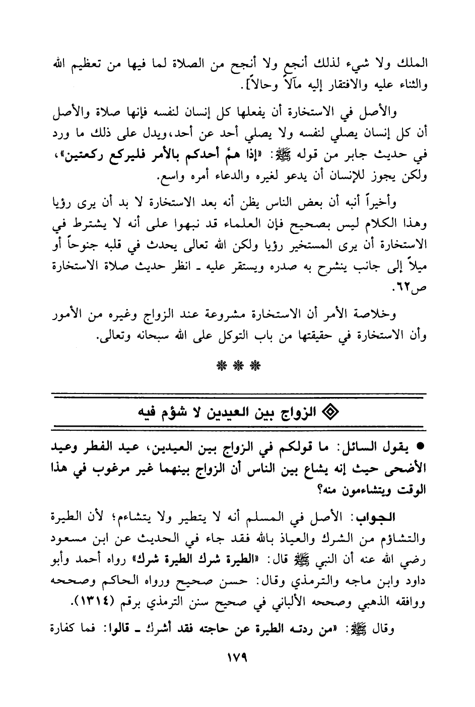يقول السائل: ما قولكم في الزواج بين العيدين، عيد الفطر وعيد الأضحى حيث إنه يشاع بين الناس أن الزواج بينهما غير مرغوب في هذا الوقت ويتشاءمون منه؟