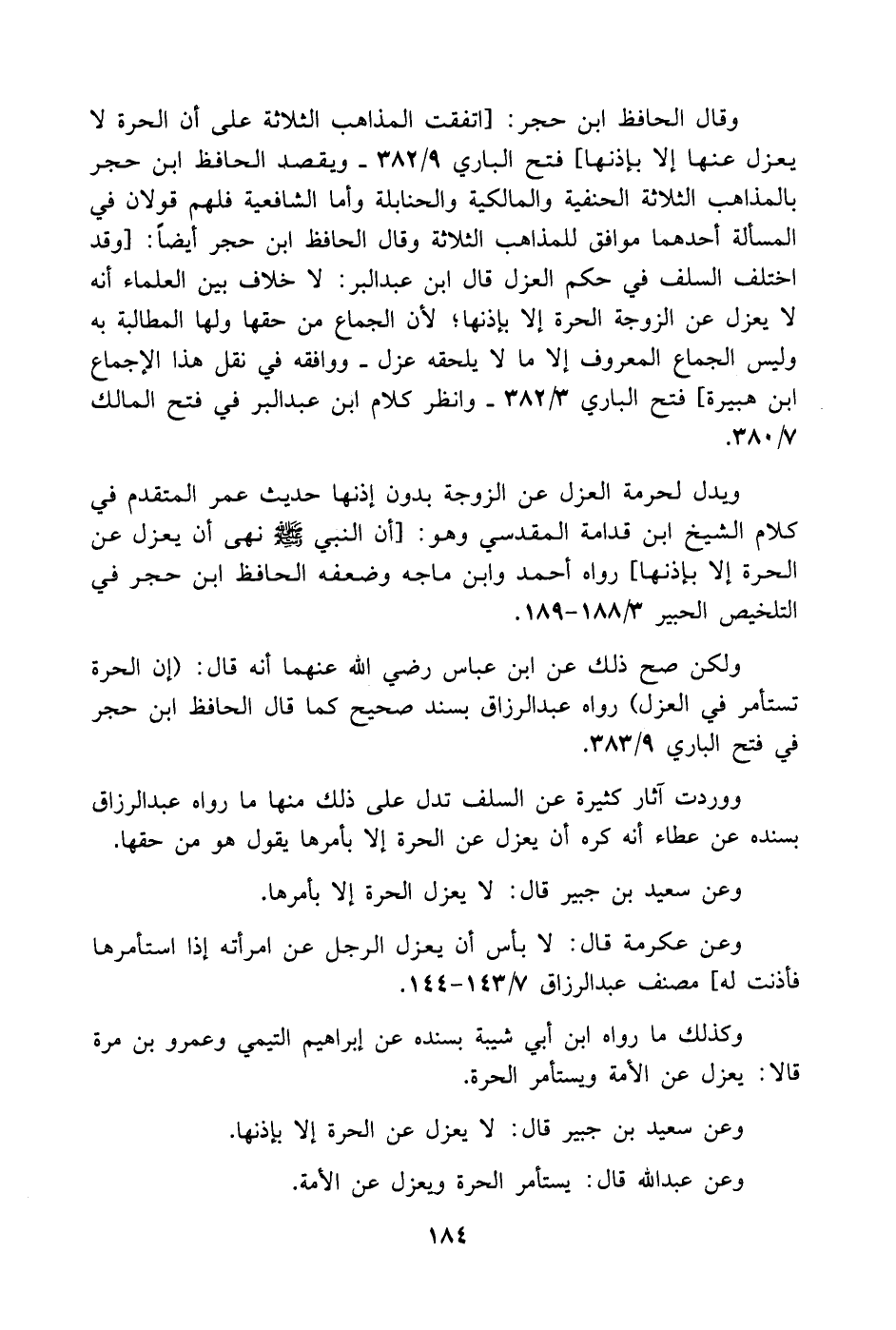 وقال الحافظ ابن حجر: [اتفقت المذاهب الثلاثة على أن الحرة لا يعزل عنها إلا بإذنها] فتح الباري 9/ 382. ويقصد الحافظ ابن حجر بالمذاهب الثلاثة الحنفية والمالكية والحنابلة وأما الشافعية فلهم قولان في المسألة أحدهما موافق للمذاهب الثلاثة وقال الحافظ ابن حجر أيضاً: [وقد اختلف السلف في حكم العزل قال ابن عبد البر: لا خلاف بين العلماء أنه لا يعزل عن الزوجة الحرة إلا بإذنها لأن الجماع من حقها ولها المطالبة به وليس الجماع المعروف إلا ما لا يلحقه عزل. ووافقه في نقل هذا الإجماع ابن هبيرة] فتح الباري 3/ 382. وانظر كلام ابن عبد البر في فتح المالك 7/ 380.
