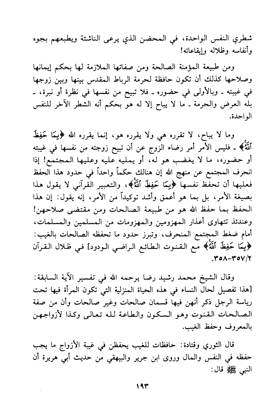 وقال الشيخ محمد رشيد رضا يرحمه الله في تفسير الآية السابقة: [هذا تفصيل لحال النساء في هذه الحياة المنزلية التي تكون المرأة فيها تحت رياسة الرجل ذكر أنهن فيها قسمان صالحات وغير صالحات وأن من صفة الصالحات القنوت وهو السكون والطاعة لله تعالى وكذا لأزواجهن بالمعروف وحفظ الغيب.