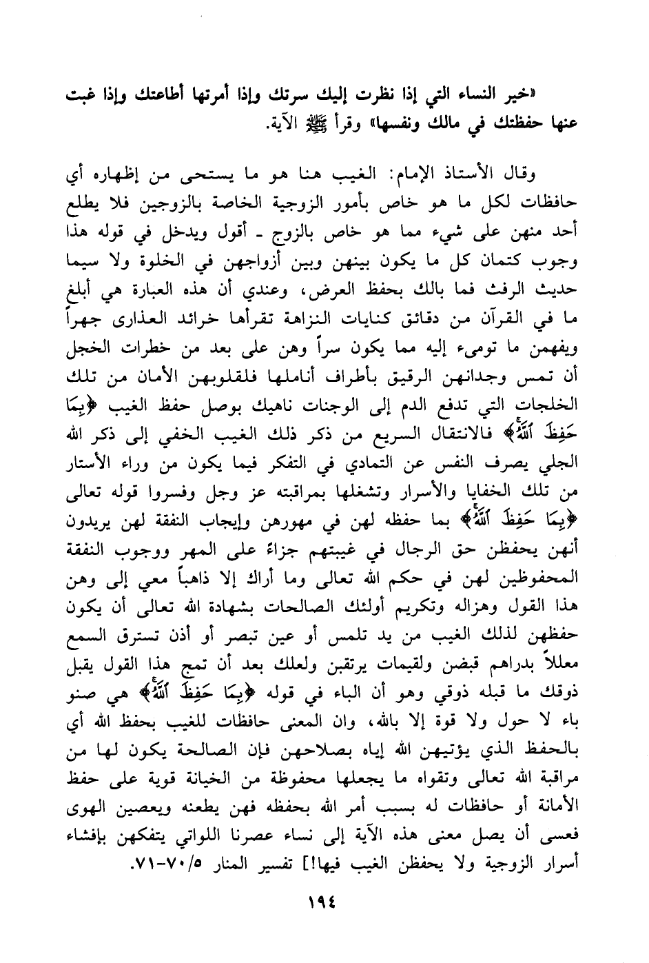 وقال الأستاذ الإمام: الغيب هنا هو ما يستحى من إظهاره أي حافظات لكل ما هو خاص بأمور الزوجية الخاصة بالزوجين فلا يطلع أحد منهن على شيء مما هو خاص بالزوج. أقول ويدخل في قوله هذا وجوب كتمان كل ما يكون بينهن وبين أزواجهن في الخلوة ولا سيما حديث الرفث فما بالك بحفظ العرض، وعندي أن هذه العبارة هي أبلغ ما في القرآن من دقائق كنايات النزاهة تقرأها خرائد العذارى جهراً ويفهمن ما تومىء إليه مما يكون سراً وهن على بعد من خطرات الخجل أن تمس وجدانهن الرقيق بأطراف أناملها فلقلوبهن الأمان من تلك الخلجات التي تدفع الدم إلى الوجنات ناهيك بوصل حفظ الغيب (بِمَا حَفِظَ اللَّهُ) فالانتقال السريع من ذكر ذلك الغيب الخفي إلى ذكر الله الجلي يصرف النفس عن التمادي في التفكر فيما يكون من وراء الأستار من تلك الخفايا والأسرار وتشغلها بمراقبته عز وجل وفسروا قوله تعالى (بِمَا حَفِظَ اللَّهُ) بما حفظه لهن في مهورهن وإيجاب النفقة لهن يريدون أنهن يحفظن حق الرجال في غيبتهم جزاءً على المهر ووجوب النفقة المحفوظين لهن في حكم الله تعالى وما أراك إلا ذاهباً معي إلى وهن هذا القول وهزاله وتكريم أولئك الصالحات بشهادة الله تعالى أن يكون حفظهن لذلك الغيب من يد تلمس أو عين تبصر أو أذن تسترق السمع معللاً بدراهم قبضن ولقيمات يرتقبن ولعلك بعد أن تمج هذا القول يقبل ذوقك ما قبله ذوقي وهو أن الباء في قوله (بِمَا حَفِظَ اللَّهُ) هي صنو باء لا حول ولا قوة إلا بالله، وان المعنى حافظات للغيب بحفظ الله أي بالحفظ الذي يؤتيهن الله إياه بصلاحهن فإن الصالحة يكون لها من مراقبة الله تعالى وتقواه ما يجعلها محفوظة من الخيانة قوية على حفظ الأمانة أو حافظات له بسبب أمر الله بحفظه فهن يطعنه ويعصين الهوى فعسى أن يصل معنى هذه الآية إلى نساء عصرنا اللواتي يتفكهن بإفشاء أسرار الزوجية ولا يحفظن الغيب فيها!] تفسير المنار 5/ 70 - 71.