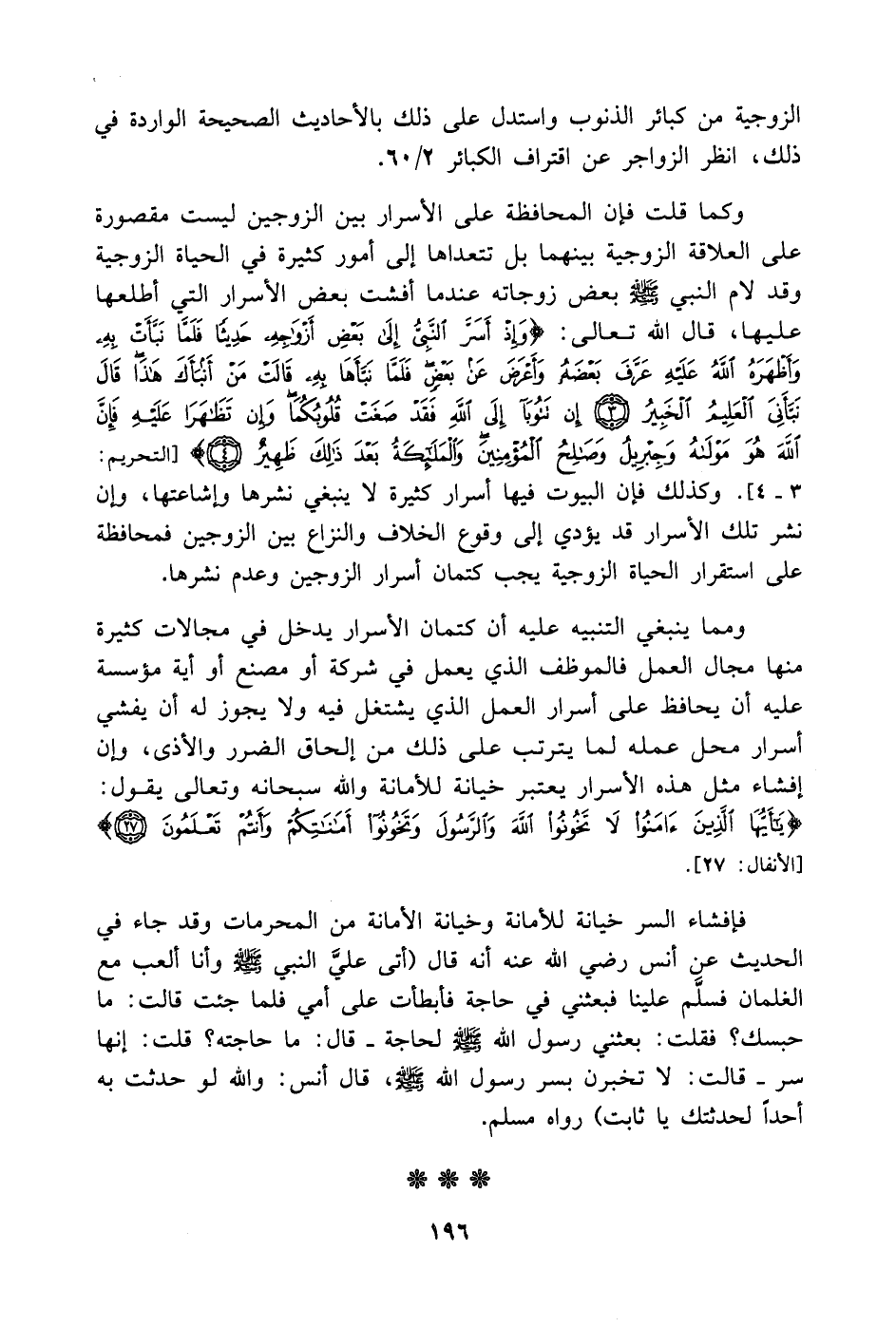 وكما قلت فإن المحافظة على الأسرار بين الزوجين ليست مقصورة على العلاقة الزوجية بينهما بل تتعداها إلى أمور كثيرة في الحياة الزوجية وقد لام النبي - صَلَّى اللهُ عَلَيْهِ وَسَلَّمَ - بعض زوجاته عندما أفشت بعض الأسرار التي أطلعها عليها، قال الله تعالى: (وإذ أَسَرَّ النَّبِيُّ إِلَى بَعْضِ أَزْوَاجِهِ حَدِيثًا فَلَمَّا نَبَّأَتْ بِهِ وَأَظْهَرَهُ اللَّهُ عَلَيْهِ عَرَّفَ بَعْضَهُ وَأَعْرَضَ عَنْ بَعْضٍ فَلَمَّا نَبَّأَهَا بِهِ قَالَتْ مَنْ أَنْبَأَكَ هَذَا قَالَ نَبَّأَنِيَ الْعَلِيمُ الْخَبِيرُ إِنْ تَتُوبَا إِلَى اللَّهِ فَقَدْ صَغَتْ قُلُوبُكُمَا وَإِنْ تَظَاهَرَا عَلَيْهِ فَإِنَّ اللَّهَ هُوَ مَوْلَاهُ وَجِبْرِيلُ وَصَالِحُ الْمُؤْمِنِينَ وَالْمَلَائِكَةُ بَعْدَ ذَلِكَ ظَهِيرٌ) سورة التحريم الآيتان 3 - 4. وكذلك فإن البيوت فيها أسرار كثيرة لا ينبغي نشرها وإشاعتها وإن نشر تلك الأسرار قد يؤدي إلى وقوع الخلاف والنزاع بين الزوجين فمحافظة على استقرار الحياة الزوجية يجب كتمان أسرار الزوجين وعدم نشرها.