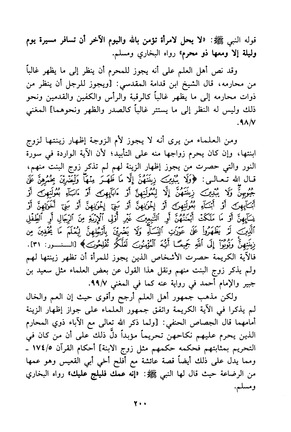ولكن مذهب جمهور أهل العلم أرجح وأقوى حيث إن العم والخال لم يذكرا في الآية الكريمة واتفق جمهور العلماء على جواز إظهار الزينة أمامهما قال الجصاص الحنفي: [ولما ذكر الله تعالى مع الآباء ذوي المحارم الذين يحرم عليهم نكاحهن تحريماً مؤبداً دلَّ ذلك على أن من كان في التحريم بمثابتهم فحكمه حكمهم مثل زوج الابنة] أحكام القرآن 5/ 174. ومما يدل على ذلك أيضاً قصة عائشة مع أفلح أخي أبي القعيس وهو عمها من الرضاعة حيث قال لها النبي - صَلَّى اللهُ عَلَيْهِ وَسَلَّمَ -: (إنه عمك فليلج عليك) رواه البخاري ومسلم.