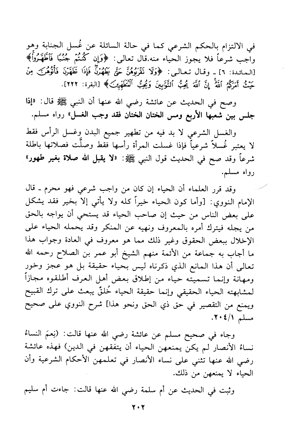 في الالتزام بالحكم الشرعي كما في حالة السائلة عن غُسل الجنابة وهو واجب شرعاً فلا يجوز الحياء منه. قال تعالى: (وَإِنْ كُنْتُمْ جُنُبًا فَاطَّهَّرُوا) سورة المائدة الآية 6. وقال تعالى: (وَلَا تَقْرَبُوهُنَّ حَتَّى يَطْهُرْنَ فَإِذَا تَطَهَّرْنَ فَأْتُوهُنَّ مِنْ حَيْثُ أَمَرَكُمُ اللَّهُ إِنَّ اللَّهَ يُحِبُّ التَّوَّابِينَ وَيُحِبُّ الْمُتَطَهِّرِينَ) سورة البقرة الآية 222.