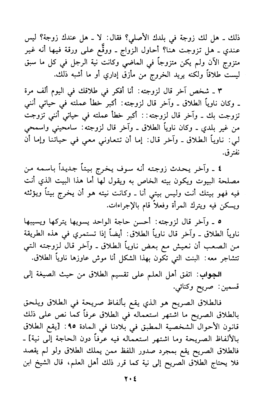 ذلك. هل لك زوجة في بلدك الأصلي؟ فقال: لا. هل عندك زوجة؟ ليس عندي. هل تزوجت هنا؟ أحاول الزواج. ووقَّع على ورقة فيها أنه غير متزوج الآن ولم يكن متزوجاً في الماضي وكانت نية الرجل في كل ما سبق ليست طلاقاً ولكنه يريد الخروج من مأزق إداري أو ما أشبه ذلك.