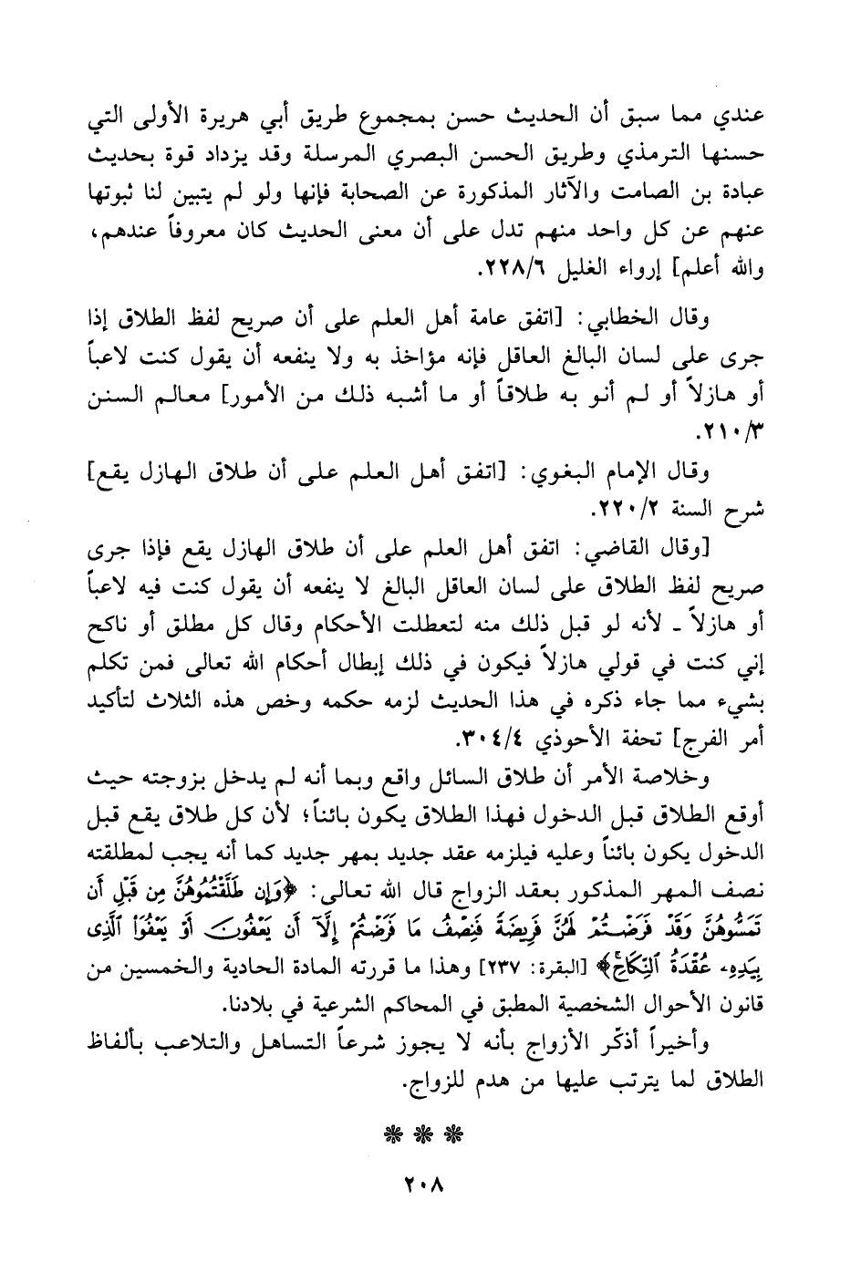 [وقال القاضي: اتفق أهل العلم على أن طلاق الهازل يقع فإذا جرى صريح لفظ الطلاق على لسان العاقل البالغ لا ينفعه أن يقول كنت فيه لاعباً أو هازلاً. لأنه لو قبل ذلك منه لتعطلت الأحكام وقال كل مطلق أو ناكح إني كنت في قولي هازلاً فيكون في ذلك إبطال أحكام الله تعالى فمن تكلم بشيء مما جاء ذكره في هذا الحديث لزمه حكمه وخص هذه الثلاث لتأكيد أمر الفرج] تحفة الأحوذي 4/ 304.