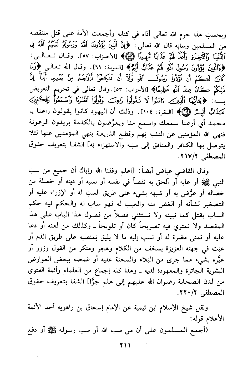 وقال القاضي عياض أيضاً: [اعلم وفقنا الله وإياك أن جميع من سب النبي - صَلَّى اللهُ عَلَيْهِ وَسَلَّمَ - أو عابه أو ألحق به نقصاً في نفسه أو نسبه أو دينه أو خصلة من خصاله أو عرَّض به أو شبهه بشيء على طريق السب له أو الإزراء عليه أو التصغير لشأنه أو الغض منه والعيب له فهو ساب له والحكم فيه حكم الساب يقتل كما نبينه ولا نستثني فصلاً من فصول هذا الباب على هذا المقصد ولا نمتري فيه تصريحاً كان أو تلويحاً. وكذلك من لعنه أو دعا عليه أو تمنى مضرة له أو نسب إليه ما لا يليق بمنصبه على طريق الذم أو عبث في جهته العزيزة بسخف من الكلام وهجر ومنكر من القول وزور أو عيَّره بشيء مما جرى من البلاء والمحنة عليه أو غمصه ببعض العوارض البشرية الجائزة والمعهودة لديه. وهذا كله إجماع من العلماء وأئمة الفتوى من لدن الصحابة رضوان الله عليهم إلى هلم جرَّا] الشفا بتعريف حقوق المصطفى 2/ 220.