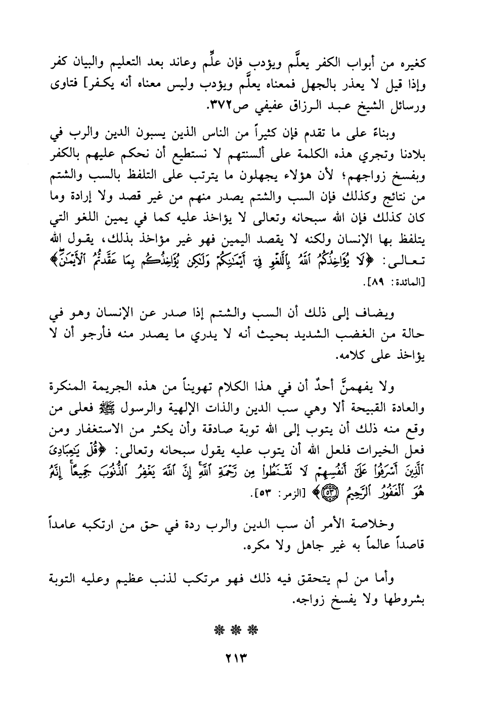 وبناءً على ما تقدم فإن كثيراً من الناس الذين يسبون الدين والرب في بلادنا وتجري هذه الكلمة على ألسنتهم لا نستطيع أن نحكم عليهم بالكفر وبفسخ زواجهم لأن هؤلاء يجهلون ما يترتب على التلفظ بالسب والشتم من نتائج وكذلك فإن السب والشتم يصدر منهم من غير قصد ولا إرادة وما كان كذلك فإن الله سبحانه وتعالى لا يؤاخذ عليه كما في يمين اللغو التي يتلفظ بها الإنسان ولكنه لا يقصد اليمين فهو غير مؤاخذ بذلك، يقول الله تعالى: (لا يُؤَاخِذُكُمُ اللَّهُ بِاللَّغْوِ فِي أَيْمَانِكُمْ وَلَكِنْ يُؤَاخِذُكُمْ بِمَا عَقَّدْتُمُ الْأَيْمَانَ) سورة المائدة الآية 89.