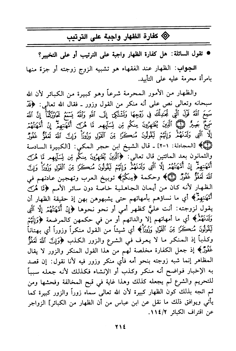 المخالفة وفحشها ومن ثم اتجه بذلك كون الظهار كبيرة لأن الله تعالى سماه زوراً والزور كبيرة كما يأتي ويوافق ذلك ما نقل عن ابن عباس من أن الظهار من الكبائر] الزواجر عن اقتراف الكبائر 2/ 114.