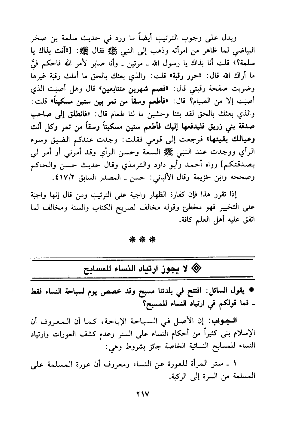 الجواب: إن الأصل في السباحة الإباحة كما أن المعروف أن الإسلام بنى كثيراً من أحكام النساء على الستر وعدم كشف العورات وارتياد النساء للمسابح النسائية الخاصة جائز بشروط وهي: