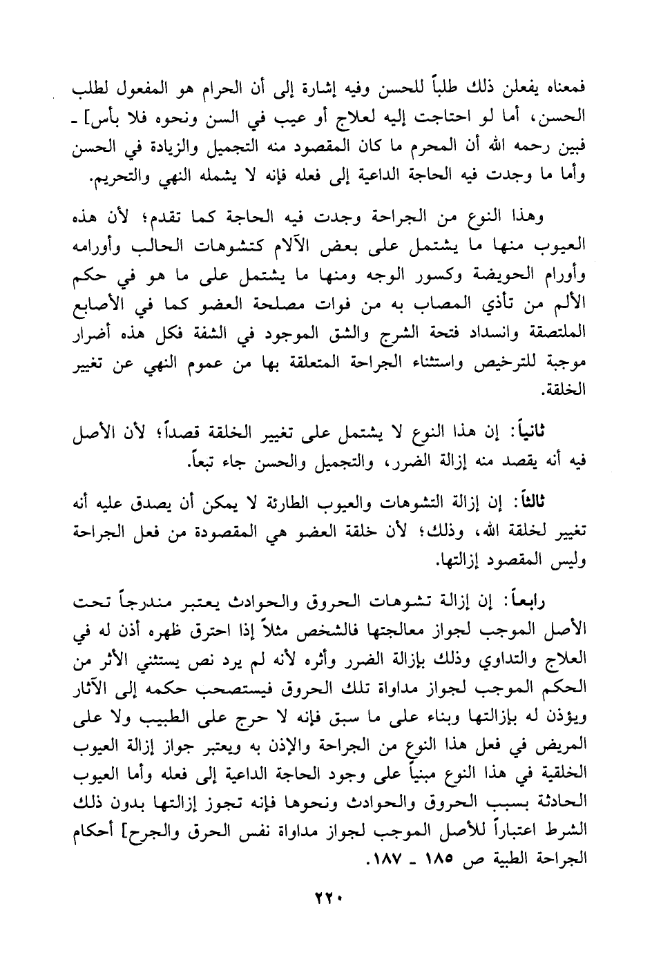 رابعاً: إن إزالة تشوهات الحروق والحوادث يعتبر مندرجاً تحت الأصل الموجب لجواز معالجتها فالشخص مثلاً إذا احترق ظهره أذن له في العلاج والتداوي وذلك بإزالة الضرر وأثره لأنه لم يرد نص يستثني الأثر من الحكم الموجب لجواز مداواة تلك الحروق فيستصحب حكمه إلى الآثار ويؤذن له بإزالتها وبناء على ما سبق فإنه لا حرج على الطبيب ولا على المريض في فعل هذا النوع من الجراحة والإذن به ويعتبر جواز إزالة العيوب الخلقية في هذا النوع مبنياً على وجود الحاجة الداعية إلى فعله وأما العيوب الحادثة بسبب الحروق والحوادث ونحوها فإنه تجوز إزالتها بدون ذلك الشرط اعتباراً للأصل الموجب لجواز مداواة نفس الحرق والجرح] أحكام الجراحة الطبية ص 185 - 187.