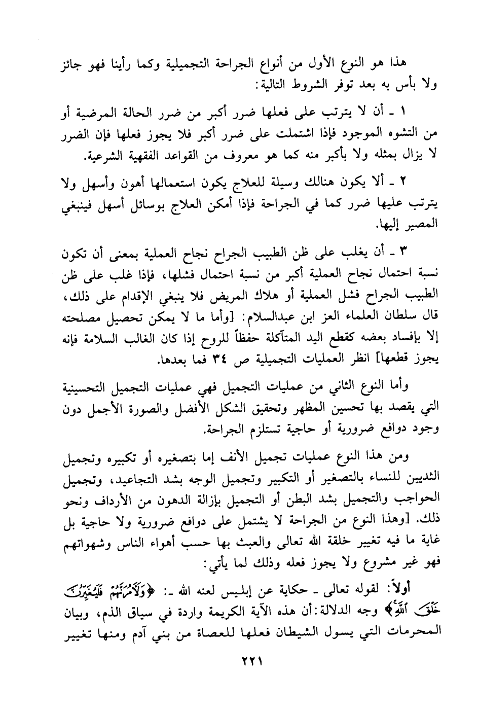 هذا هو النوع الأول من أنواع الجراحة التجميلية وكما رأينا فهو جائز ولا بأس به بعد توفر الشروط التالية: