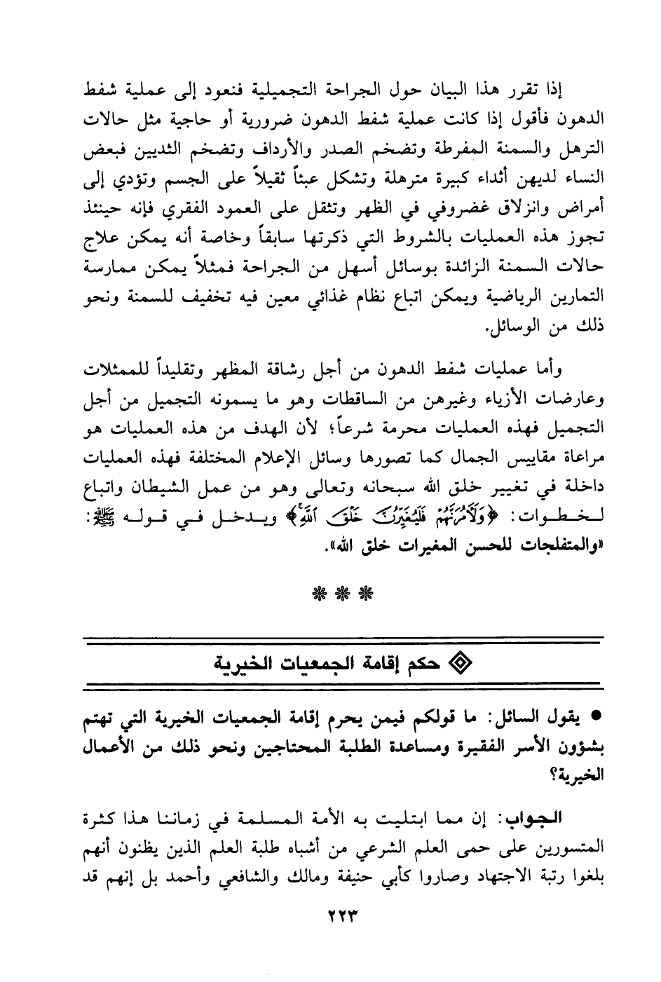 إذا تقرر هذا البيان حول الجراحة التجميلية فنعود إلى عملية شفط الدهون فأقول إذا كانت عملية شفط الدهون ضرورية أو حاجية مثل حالات الترهل والسمنة المفرطة وتضخم الصدر والأرداف وتضخم الثديين فبعض النساء لديهن أثداء كبيرة مترهلة وتشكل عبئاً ثقيلاً على الجسم وتؤدي إلى أمراض وانزلاق غضروفي في الظهر وتثقل على العمود الفقري فإنه حينئذ تجوز هذه العمليات بالشروط التي ذكرتها سابقاً وخاصة أنه يمكن علاج حالات السمنة الزائدة بوسائل أسهل من الجراحة فمثلاً يمكن ممارسة التمارين الرياضية ويمكن اتباع نظام غذائي معين فيه تخفيف للسمنة ونحو ذلك من الوسائل.